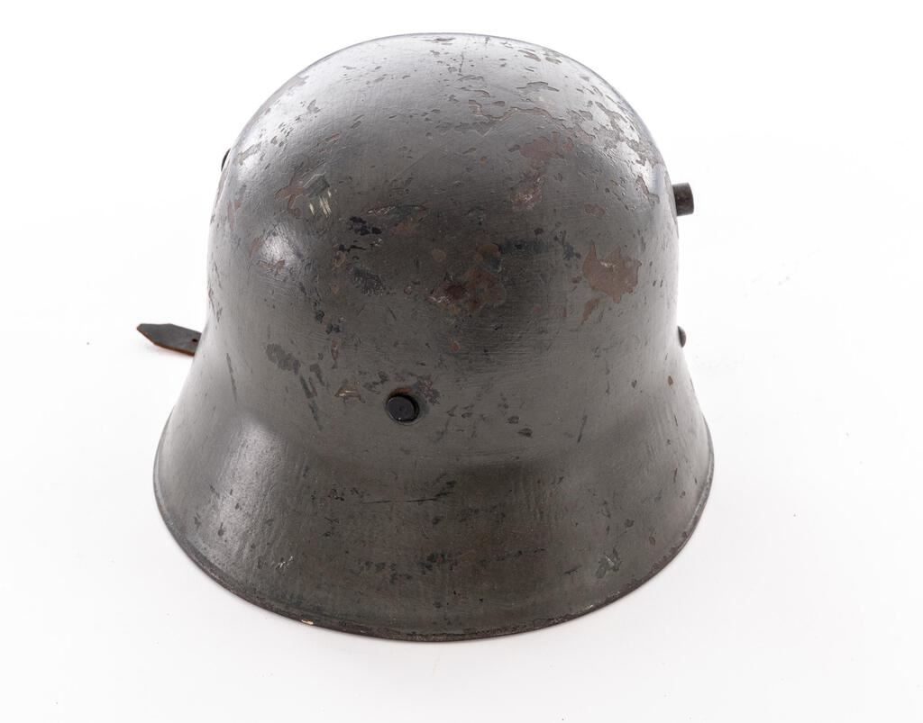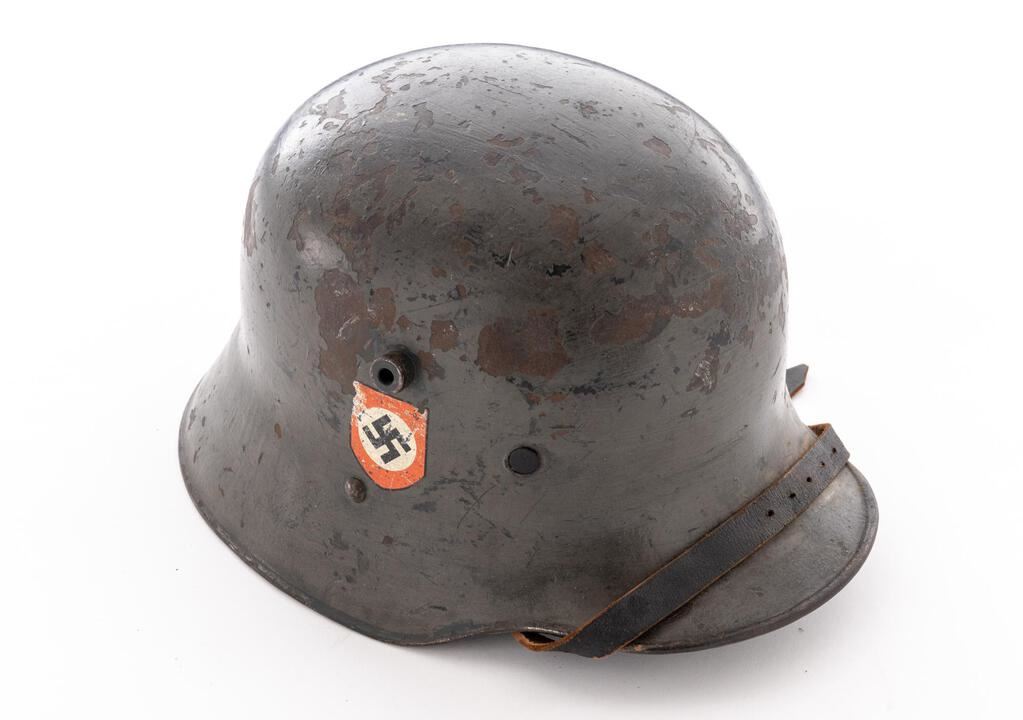 WWI/WWII German Transitional Police Helmet. A WW1 Austrian M17 helmet that has been reworked for the early German/WWII era. Gray/green painted steel body with large vent lugs, riveted chin strap mounts, replaced nine-tongue liner, original black leather chinstrap with faint ink stamp and stamped number markings. Black painted liner rivets. Early style Nazi police eagle and national shield decals on either side. Condition is good, the outside showing numerous dings, scratches, chips, and losses to the paint. Decals show wear and minor losses. Inner and outer surfaces looks like a dark green paint has been removed at some time in the past, with remnants around the liner and on the liner edges and inside under the liner. There are some losses to the paint in the center of the inside, down to bare metal. Liner looks like a later replacement with dark brown leather, no reinforcements around the holes for the string, and an original tie string. Leather is supple and shows minor age and soiling, but still smells of fresh leather. Chinstrap shows age and is a bit dry but basically sound. Est.: $500-$800.