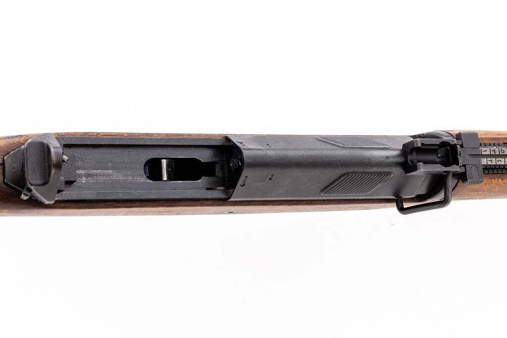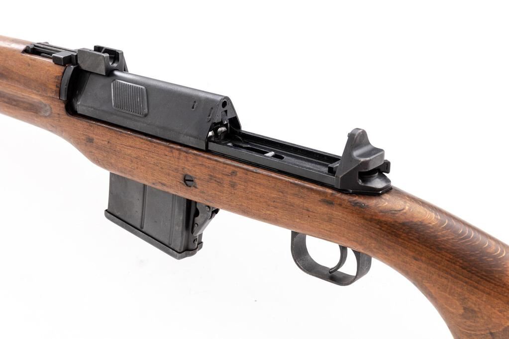 Egyptian Hakim Semi-Automatic Rifle, #38502, 8x57mm, 23.5" barrel, blued finish, hardwood stock set, hooded blade front sight and adjustable leaf rear sight. One very good condition 10-rd. magazine is attached. Marked "HAKIM 7.9mm MADE IN EGYPT" on right-side receiver rail with Arabic script and the symbol for the Maadi Co. on the left side. Condition overall is very good with the metal retaining approx. 90% finish, showing frosting to the receiver cover and cleaning to the buttplate. Stock has a cracked area behind the receiver tang and a chip to the pistol grip, otherwise the wood is very good, with applied finish over old handling marks. Action operates smoothly, bright bore is excellent with sharp well-defined rifling. Import stamped on left side of barrel. Est.: $800-$1,200. (C&R/PPT)