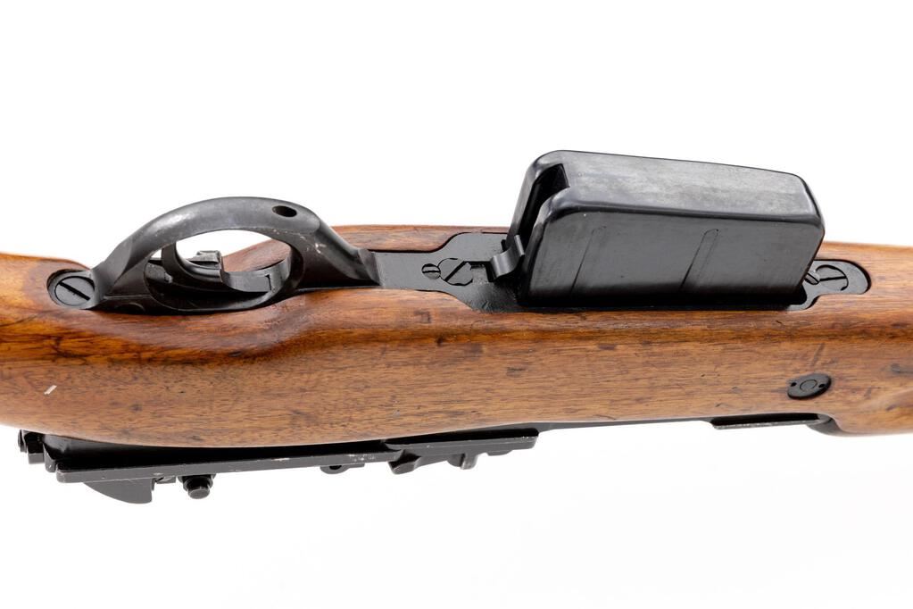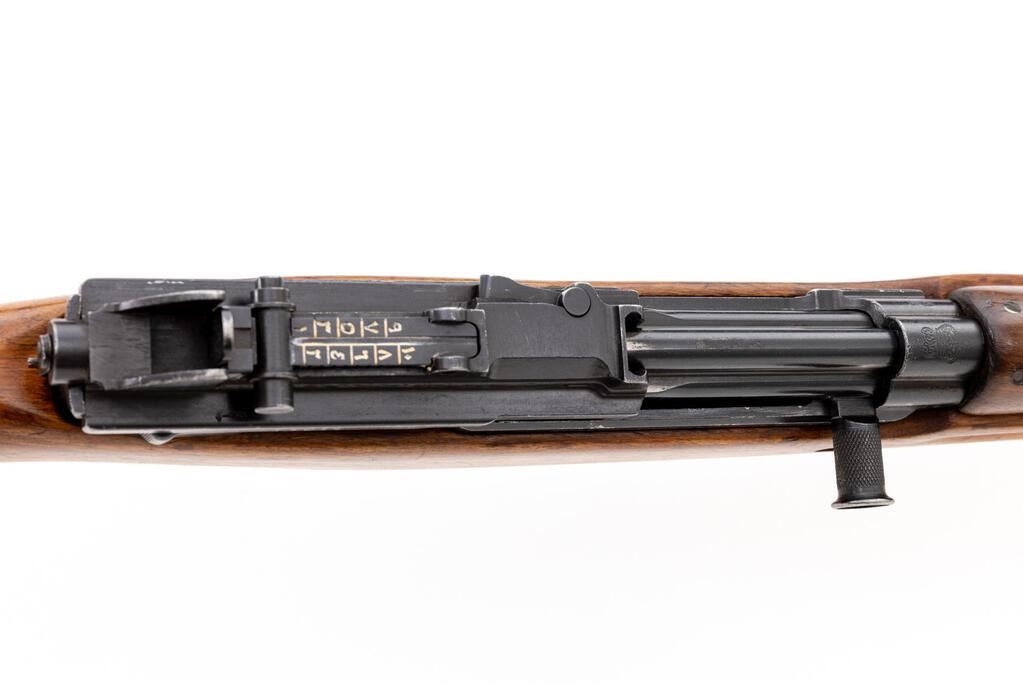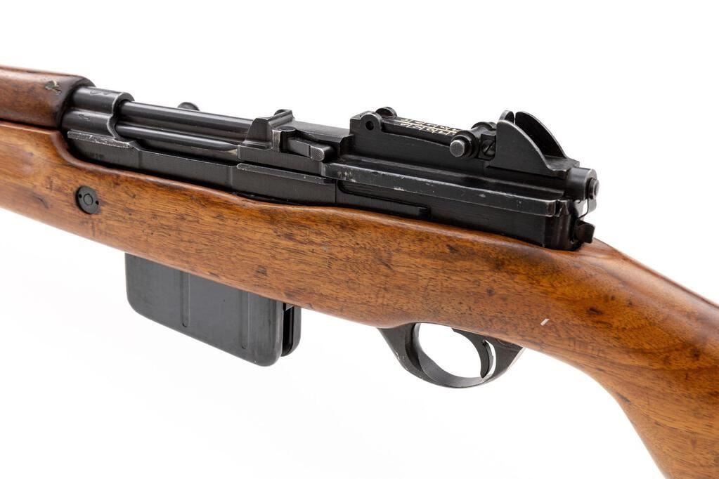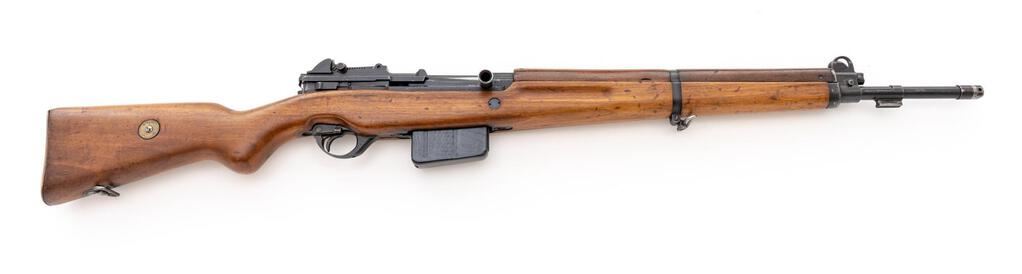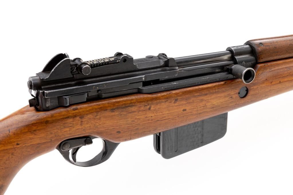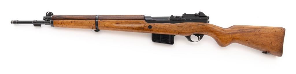 Egyptian FN-49 Semi-Automatic Rifle, #30519, 8x57mm, 23.2" barrel, blued finish, hardwood stock set, blade front sight with protectors and adjustable leaf rear sight with aperture. Brass marking disc with Arabic script mounted to right-side buttstock. Marked on top of receiver ring with Royal Egyptian crown, and on right-side receiver rail "FABRIQUE NATIONALE D'ARMES DE GUERRE_HERSTAL BELGIQUE". Matching Arabic numbers on receiver cover. Condition overall is very good as re-conditioned, with the metal retaining approx. 85% of its re-blued finish. Wood has been sanded and stained over old handling marks, now very good, showing mostly light recent scratches and impressions to the finish. Action operates smoothly; bore has slight darkening in the grooves, otherwise very good with very good rifling. Import stamped on left side receiver and underside of barrel. Est.: $800-$1,200. (C&R/PPT)