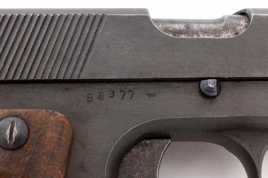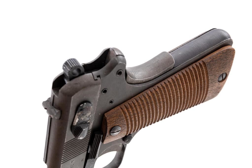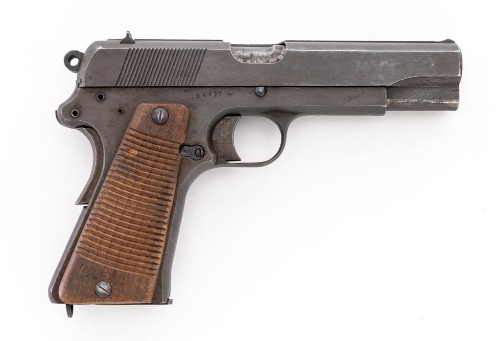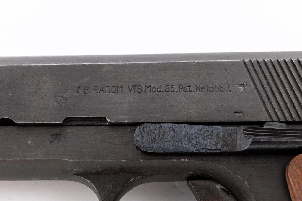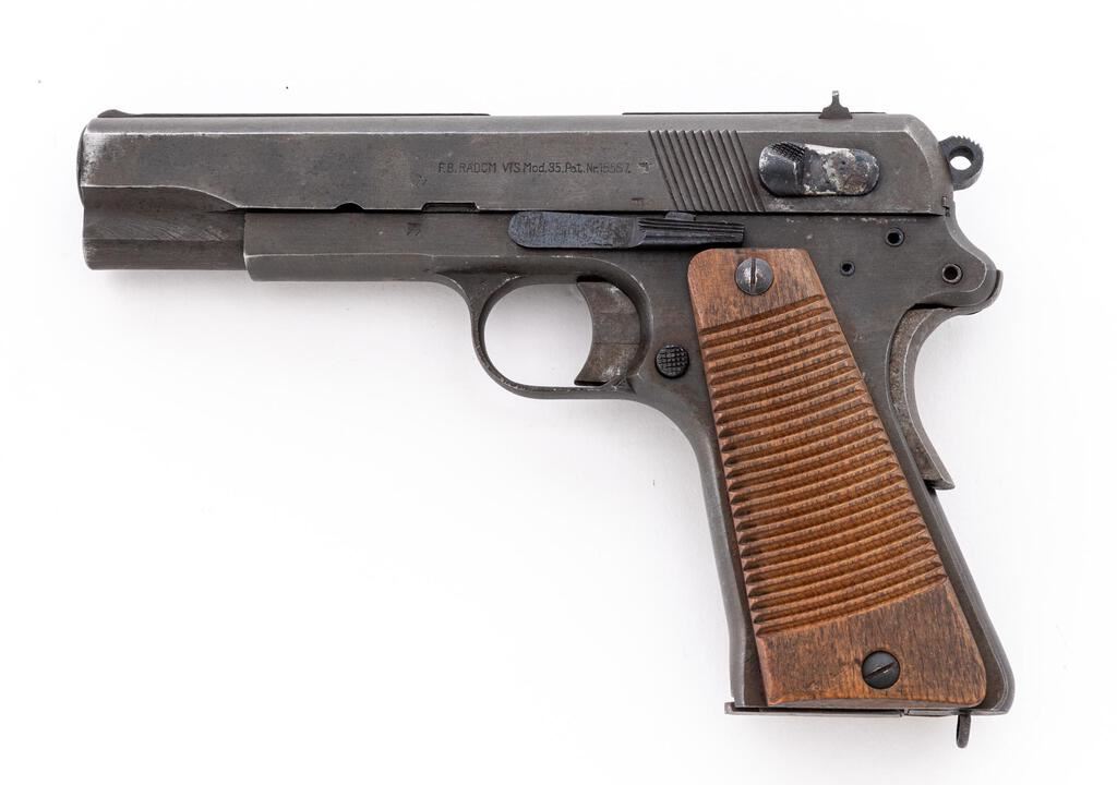 Late WWII German Marked P35 Polish Radom Semi-Automatic Pistol, #B8377, 9mm, 4.7" barrel, phosphate finish with blued small parts, slide marked with FB Radom VIS Mod.35 Pat. Nr.15567, Nazi eagle firing proof, waffenampt "(eagle)/623", "(eagle)77" waffenampt on slide and frame. Fixed thin blade ramped front sight, drift adjustable fixed rear sight with small "v" notch, welded hammer drop safety lever, grip safety, grooved wood grips, lanyard loop at bottom of mainspring housing, and one phosphate steel magazine. Condition is very good retaining approx. 90% original finish, with wear to the front and high edges of the slide, wear line on lower right front of slide, thinning to right side of the slide, dried oil stains on slide and frame, thinning to the finish on the front grip strap, wear on the sides of the trigger, and loss of finish to the welded safety lever. Action, hold open, and safeties all function properly; bore is bright and shiny. Outside of the barrel shows light rust stains and age darkening. Grips show soiling, a few light scratches and roughness, with a couple of small gouges. Grip screws show minor wear with clean slots. Magazine shows wear from use, dried oil stains, and minor rust on the bottom plate. A good Last Ditch example. Est.: $900-$1,200. (C&R/PPT)