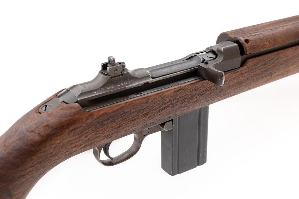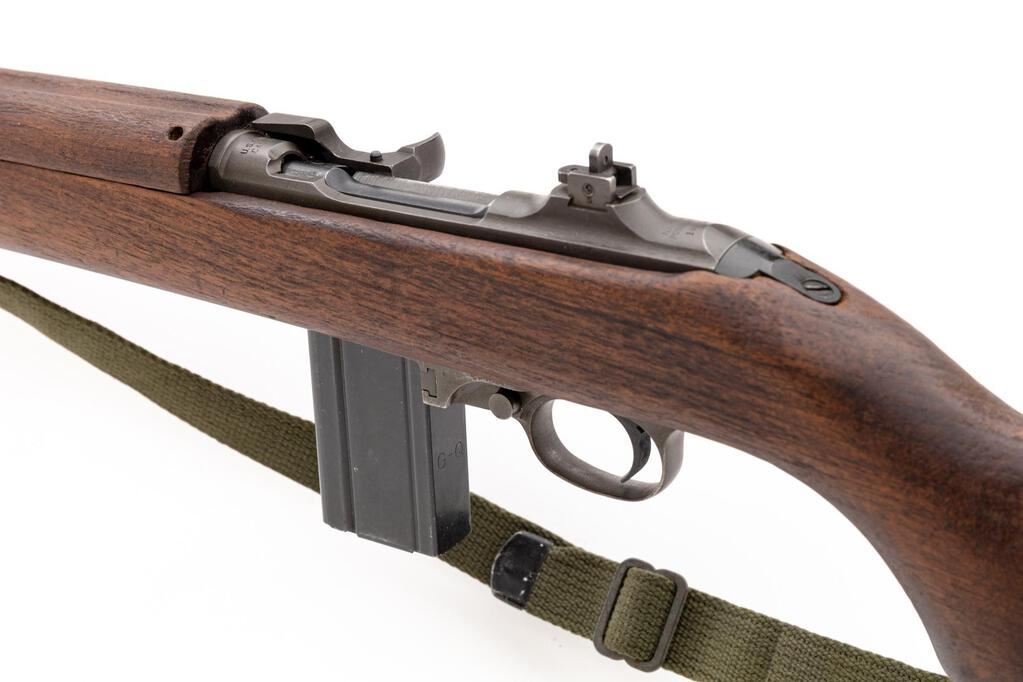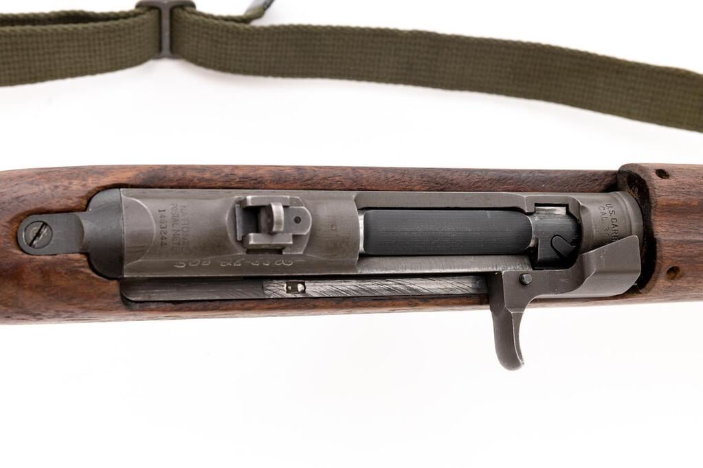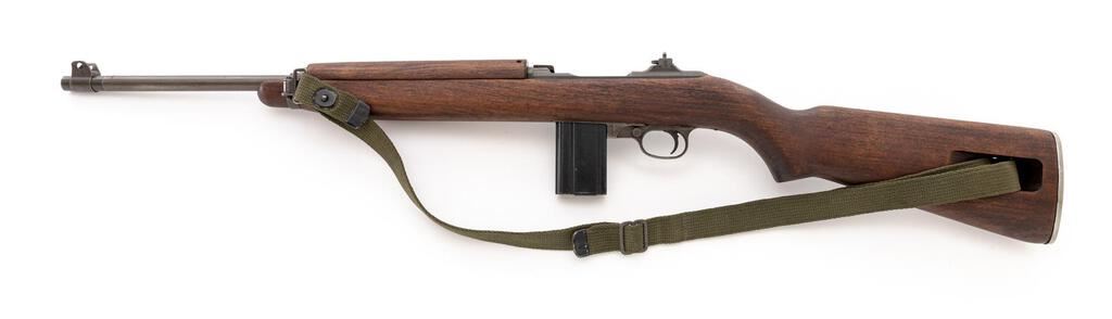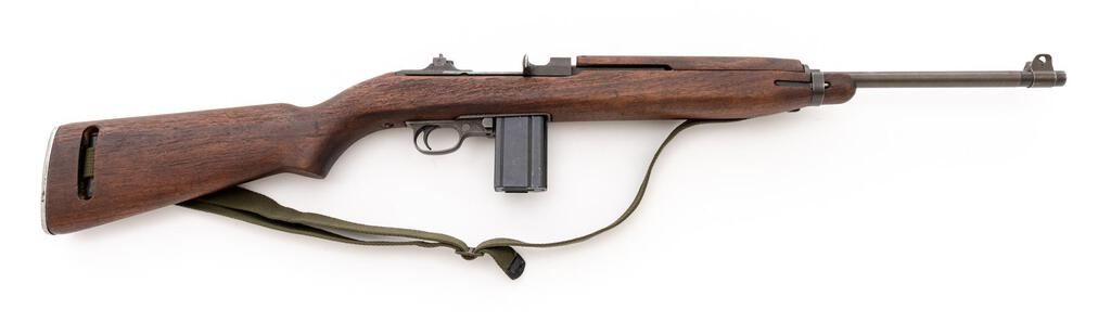 National Postal Meter M1 Semi-Automatic Carbine, #1463244, .30 Carbine cal., 18" barrel, original parkerized finish, flat bolt, walnut stock set, blade front sight with protectors and two-position flip rear sight. A U.S.G.I. oiler and very good condition green cotton sling are attached, and a very good condition 15-rd. magazine stamped "G-Q" on the spine is fitted. Marked "NATIONAL/POSTAL METER" on rear receiver tang, and "U.S.CARBINE/CAL.30 M1" on top of receiver ring. Barrel behind the front sight is marked "UNDERWOOD/2-43/(flaming bomb)". There is a faint stamp in the sling slot and a "(circle)P" firing proof on the underside of the pistol grip. A Social Security number has been electric pencil engraved onto the right-side receiver. Condition overall is very good with the metal retaining approx. 80% of its gray (now turning green) parkerizing with some areas showing darkening and the buttplate cleaned bright. Wood has been cleaned leaving a rough appearance, now very good, showing a few old handling marks. Action operates smoothly, bright bore is very good with very good rifling. No visible import marks. Est.: $1,000-$1,200. (C&R/PPT)(Hi-cap mags not available to Calif. residents.)