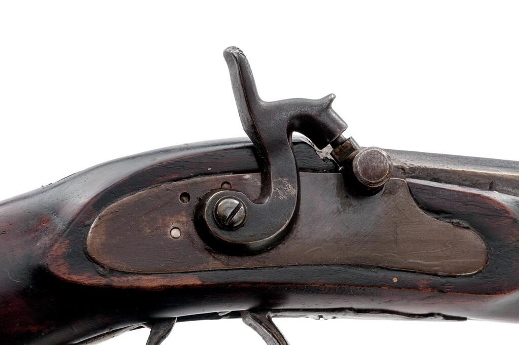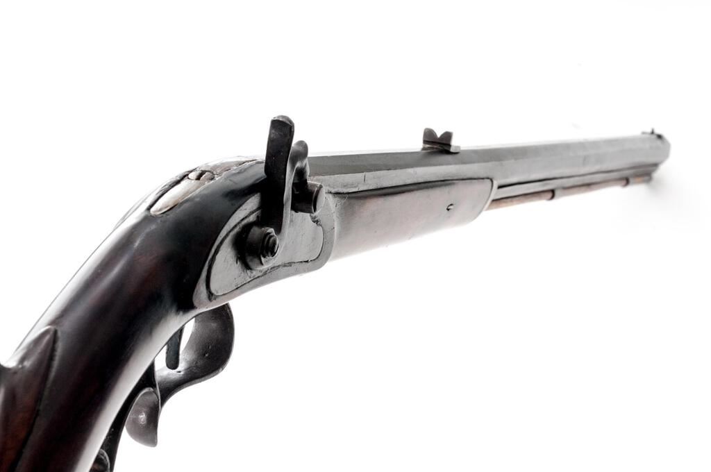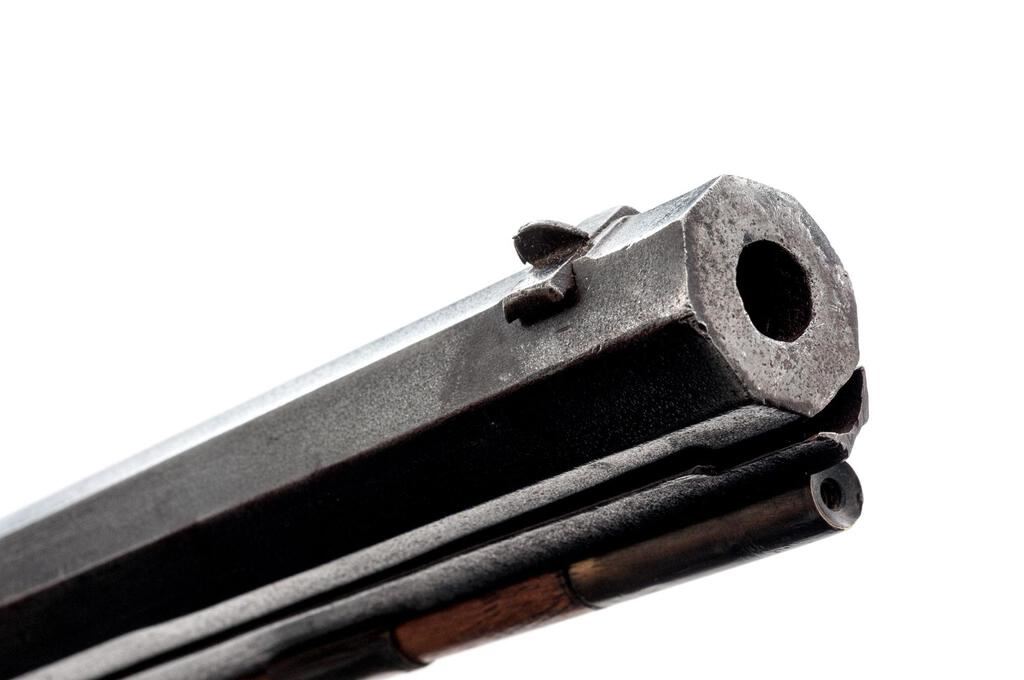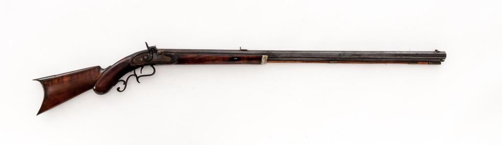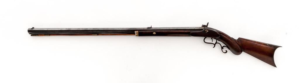Antique Percussion Sporting Rifle, Perhaps American Showing European Influence but Unmarked, NVSN, .42 cal., key-retained 34" octagonal barrel has dovetailed buckhorn sights, 2 brass pipes on full-length lower rib retaining the brass-tipped hickory ramrod; unmarked flat lockplate has sporting hammer, "drum" style nipple bolster; walnut halfstock has carved pistol-grip, fancy scrolled trigger guard, crescent buttplate, pewter nosecap. Condition is good, the barrel showing much reblued finish over light oxidation, else smooth gray gunmetal. Stock is sound and smooth with later varnish, lovely grain and color. Action does not hold cock, smoothbore appears clean. Est.: $500-$800. (Antique)