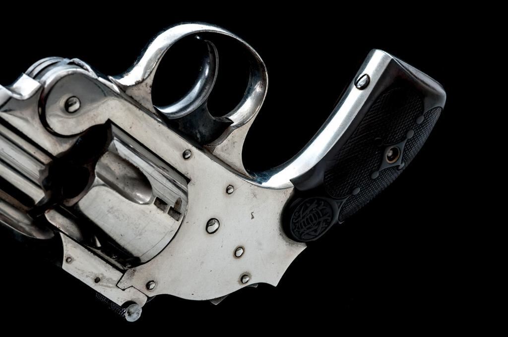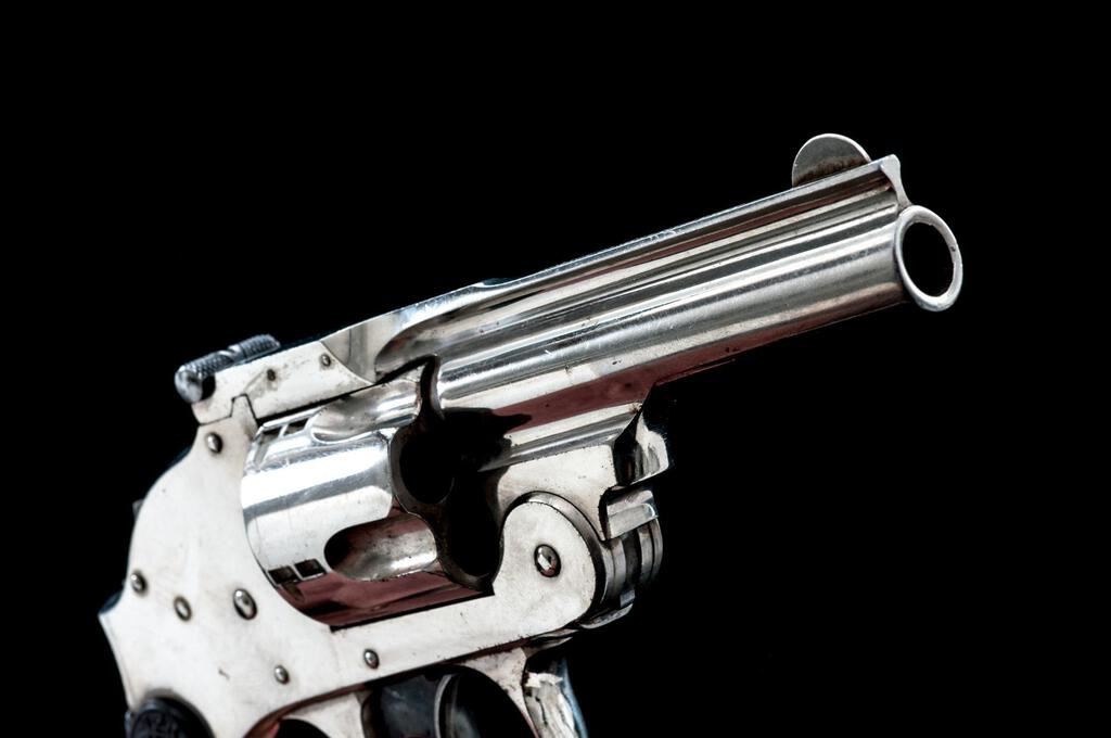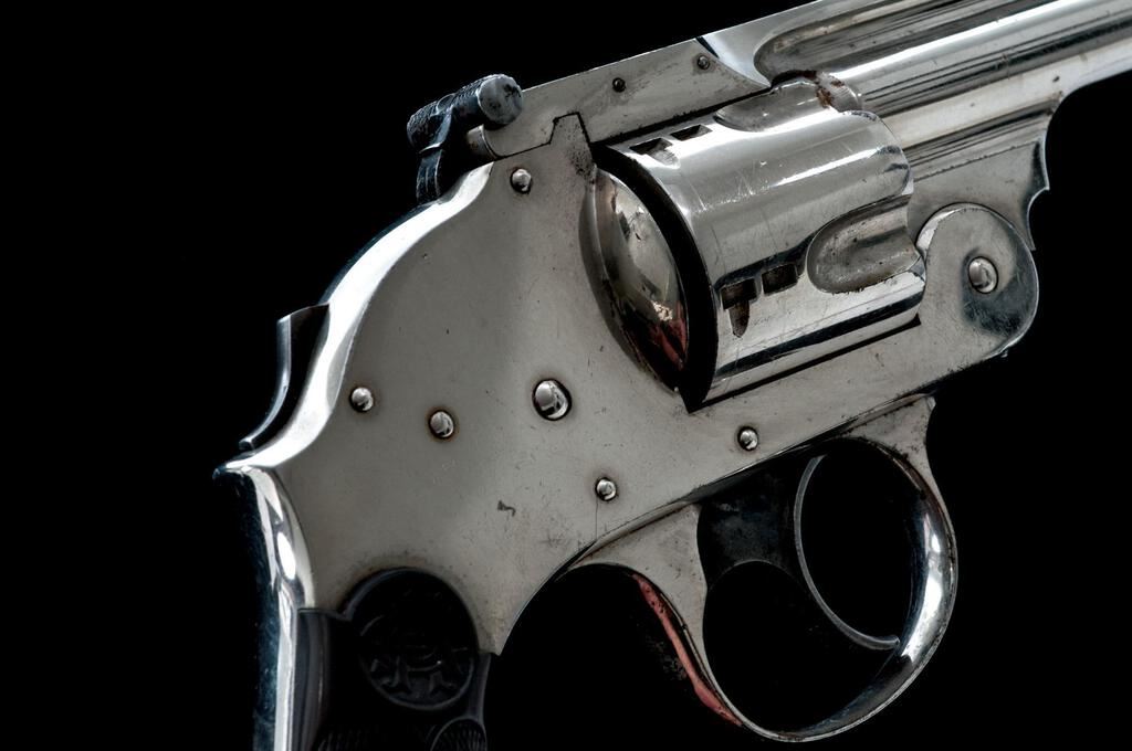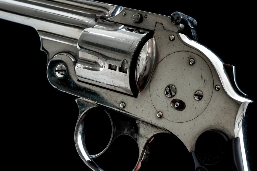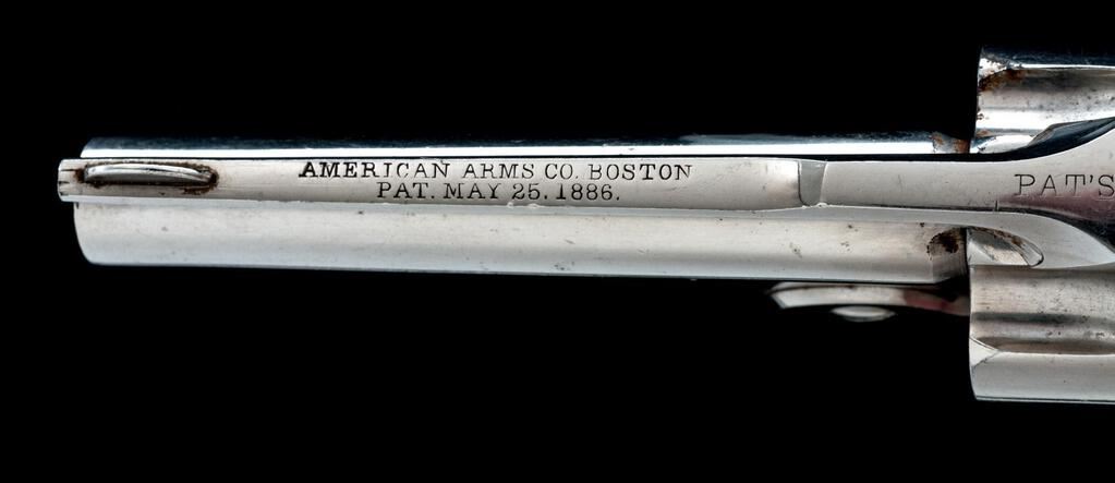 American Arms Co. Top-Break Hammerless Model 1890 SA/DA 5-Shot Revolver, NSNV, .38 S&W cal., 3.25" ribbed barrel with round blade front and fixed rear sights, hammerless, extractor, nickel finish, checkered two-piece hard rubber eagle grips, 5-shot fluted cylinder with selector switch on left side of frame. Top of barrel rib is marked "AMERICAN ARMS CO. BOSTON/PAT. MAY 25, 1886/Mar. 11'89/JUNE 17'90", indicating production prior to 1897, when the company moved from Boston to Chicopee Falls, MA. Mfg'd 1890-1901. Revolver is in near fine overall condition retaining approx. 90%-92% flaking nickel finish with light scratches, edgewear, and double index lines on the cylinder. Trigger shows muted case coloring. Left side of frame features a unique selector switch, allowing the user to choose either single or double action. Additionally, there is a manual safety behind the locking catch, above the rear grip strap. Grips are very good and fit well. Action works well, bore is fair with defined rifling. Est.: $150-$300. (Antique)