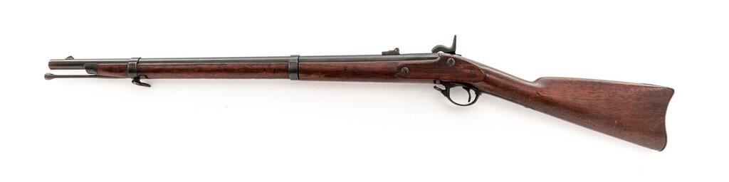 Springfield Model 1861 Single-Shot Percussion Shortened Rifle, NVSN, .58 cal., 28" round barrel with standard sights, marked "Y&C" at left breech; 1863-dated Springfield lockplate and hardware are correct Civil War M-1861 rifle pieces, as is the oil-finished 2-band walnut fullstock. Steel tulip-head ramrod. As with many surplus military arms at war's end, this rifle was likely purchased at a government auction by an arms dealer?perhaps "Y&C" in this case?shortened and lightened, then re-sold for civilian sporting use. Condition is good to very good as configured, having been refinished in blue some time ago while retaining good edges and markings. Stock is sound showing 2 vacant screw holes at top of wrist (probably for a tang sight), light marks and two inspectors' cartouches (incl. "ESA") opposite the lock. Action is crisp, bore shows cleaned frosting and good rifling. Est.: $400-$600. (Antique)