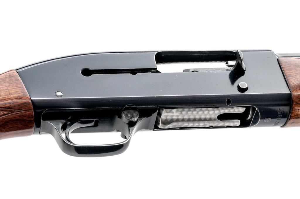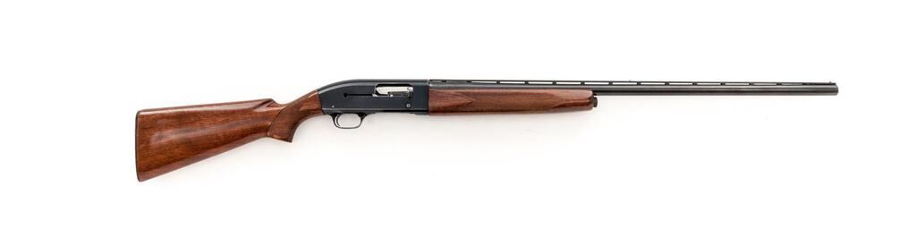 Late Winchester Model 50 Standard Grade Semi-Automatic Shotgun, #156120A. 12 ga. 30" vent rib barrel has center bead, 2-3/4" chamber, and is choked Full. The action is recoil-operated, with large safety button and machine-turned bolt and shell lifter. The full forend and pistol grip buttstock are high-gloss finished straight-grain walnut, with adequate checkering and correct Winchester buttplate. Mfg'd in 1960. Condition is very good, showing field use but no abuse. Wood has a few small handling marks, metal has expected bluing wear on receiver edges and contact areas. Action functions correctly, bore is good. Est.: $400-$500. (C&R)