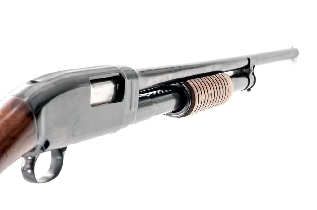 Early Winchester Model 1912 Field Grade Slide-Action Shotgun, #123133. 20 ga. 25" plain nickel steel barrel has a 2-9/16" chamber and is choked Full. Action is standard Model 12, forend replaced with later Model 12, and uncheckered buttstock replaced with higher grade wood, original Winchester buttplate retained. Mfg'd 1916. Condition is like new with reblued receiver and barrel, and upgraded wood. Action is a little sticky but functions correctly; bore is rough but not pitted. Est.: $400-$500. (C&R)
