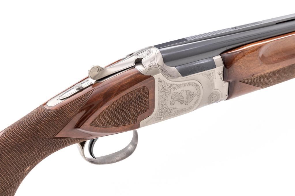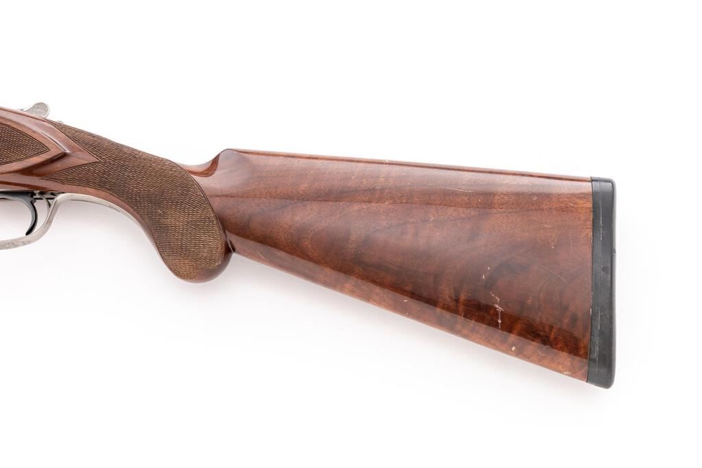Winchester Model 101 Pigeon Grade XTR Lightweight Over/Under Shotgun, #PK493545E. 12 ga. 27" vent rib barrels have target beads, 3" chambers, and are fitted for the early Winchokes that protrude from the muzzles (six included, Skt-XF, with Winchester wooden handle spanner wrench). The boxlock action features a single selective mechanical trigger, non-auto safety, and auto ejectors. The receiver, trigger guard, forend iron, top tang and operating lever are coin-finished, with engraved game birds surrounded by floral patterns. The finger-groove forend and round pistol grip buttstock are of high-gloss "C" Grade European walnut, with extensive checkering and original Winchester butt pad. Stock measurements are 14-1/4"x1-1/2"x2-1/8". Gun is contained in the original green canvas Winchester hard case, with multi-lingual instructions. Mfg'd mid-1980's. Condition is good to very good retaining approx. 70% finish with average wear to action, which locks tight and functions correctly. Wood has numerous scratches and mars that detract from appearance. Bores are bright. Est.: $1,000-$1,200. (Modern)