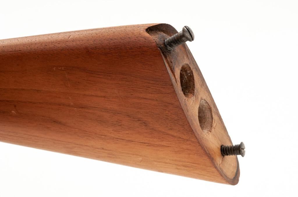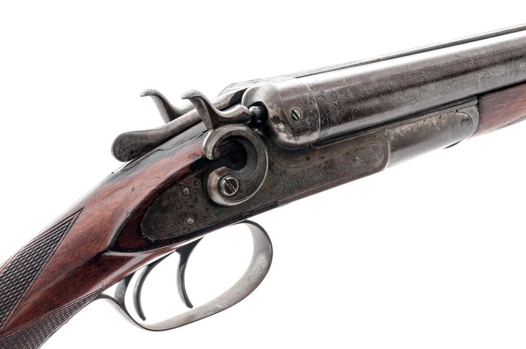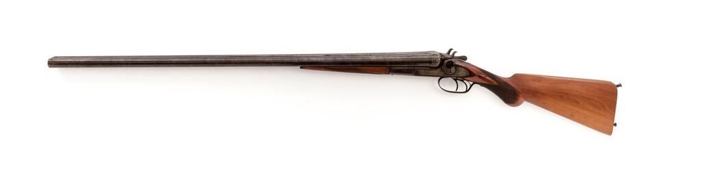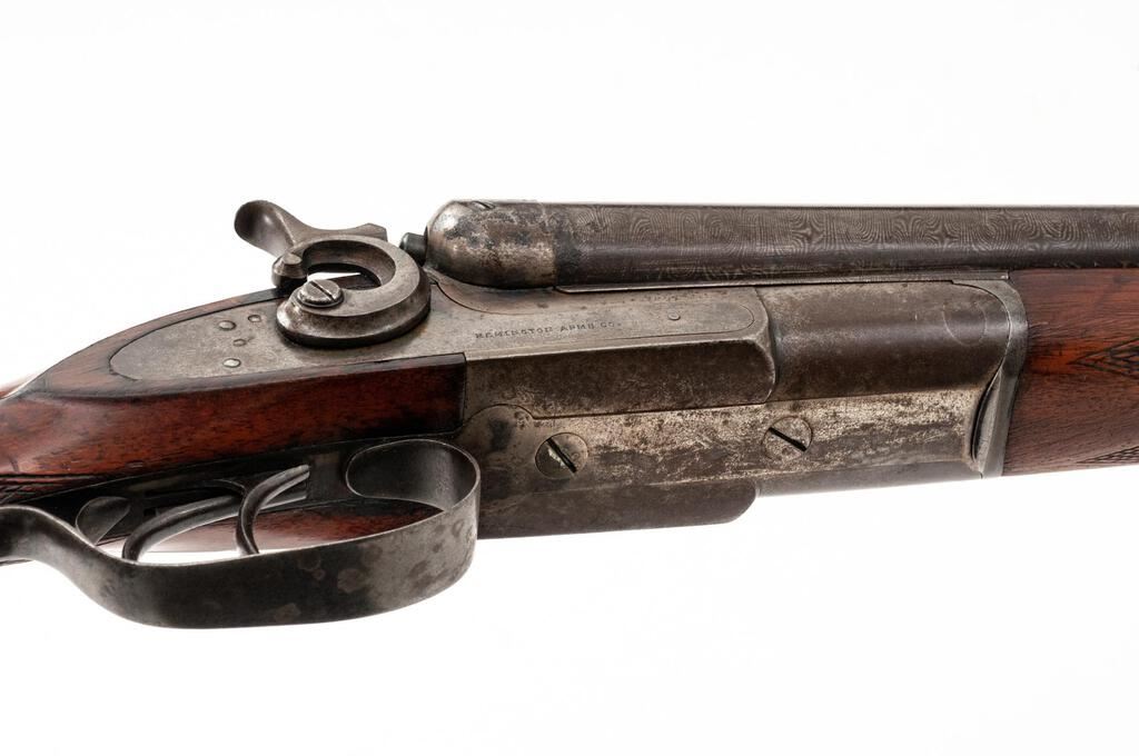 Remington Model 1889 Grade 3 Hammer-Type Side-by-Side Shotgun, #224323. 12 ga. 32" solid rib Damascus barrels have 2-3/4" chambers and are choked IM/IM. The 1889 action features lockup via dual underlugs plus doll's head rib extension, dual hammers and triggers, and simple extractors. The lockplates are unengraved except for the maker's stamp. The splinter forend and Prince of Wales round-knob pistol grip buttstock are oil-finished walnut and feature an ebony forend tip and good coverage of checkering; buttplate is missing. Mfg'd approx. 1902. Condition is good, with wood either refinished or replaced. Action closes tight but the action lever has a broken spring. Locks, triggers and hammers function correctly, as does the extractor. Approx. 50% faded Damascus finish remains, receiver has gone to a dull patina; bores are pitted. A good candidate for a restoration. Est.: $400-$500. (C&R)