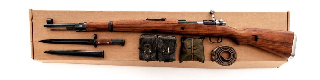 Yugoslavian M48 Mauser Bolt Action Rifle, with Accessories, #A48135, 8x57mm, 23.25" barrel, blued finish, hardwood stock set, inverted "V" front with attached hood and adjustable tangent rear sight. Accessories include cleaning rod mounted under barrel, arsenal reconditioned bayonet with matching numbered scabbard and leather frog, owner's manual, leather sling, two-cell ammunition pouch, cleaning kit, and shipping box with matching serial number, all in good to very good condition. Rifle marked on top of receiver ring with Yugoslavian crest over "M48". Left-side receiver rail marked with Cyrillic "NPEAY3EKE 44". Matching numbers with magazine floorplate renumbered to match. Condition overall is very good with the metal retaining almost all of its dark blue finish. Bright bolt handle has areas of light to moderate patina. Wood is close to excellent with an even colored finish and a few scattered handling marks. Action operates smoothly, bright bore is excellent with well-defined rifling. Import stamped on underside of barrel. Est.: $500-$700. (C&R)