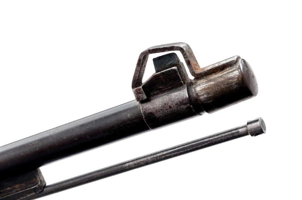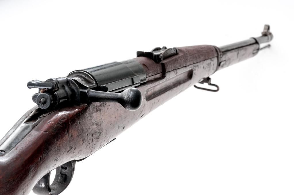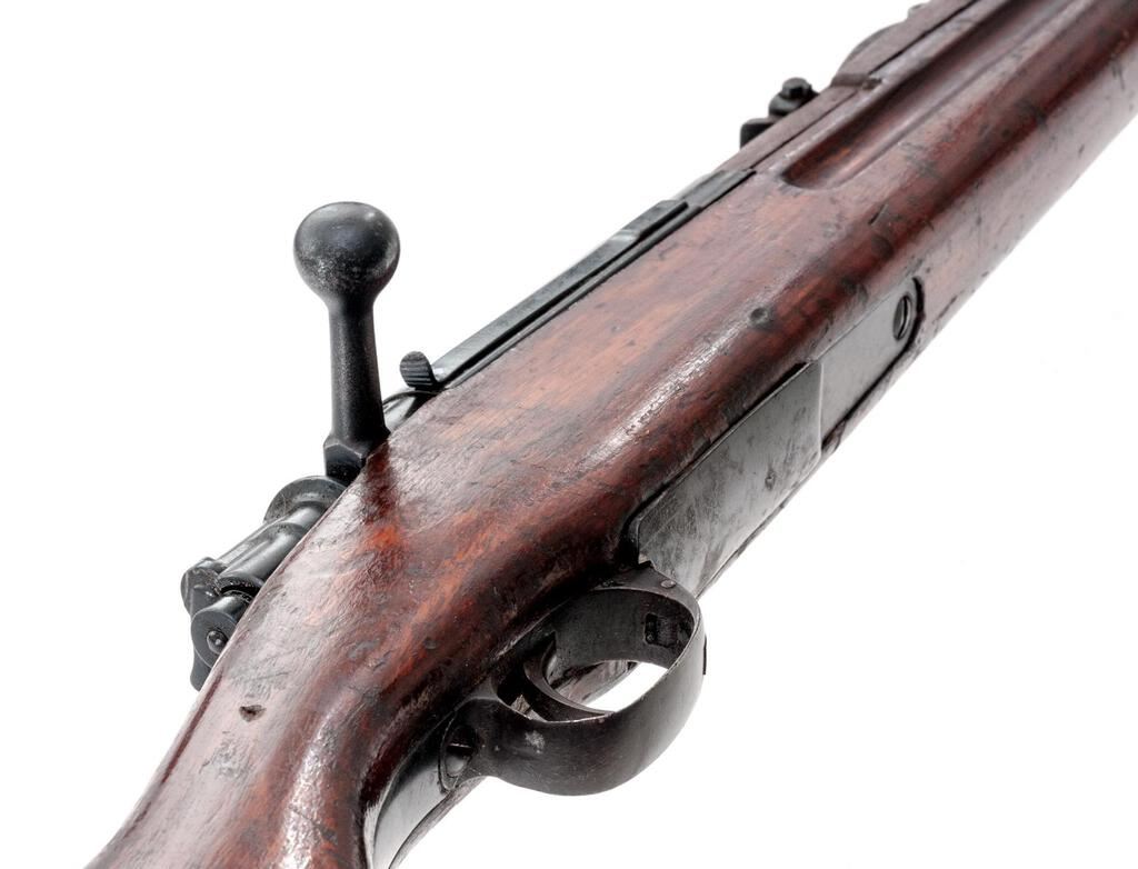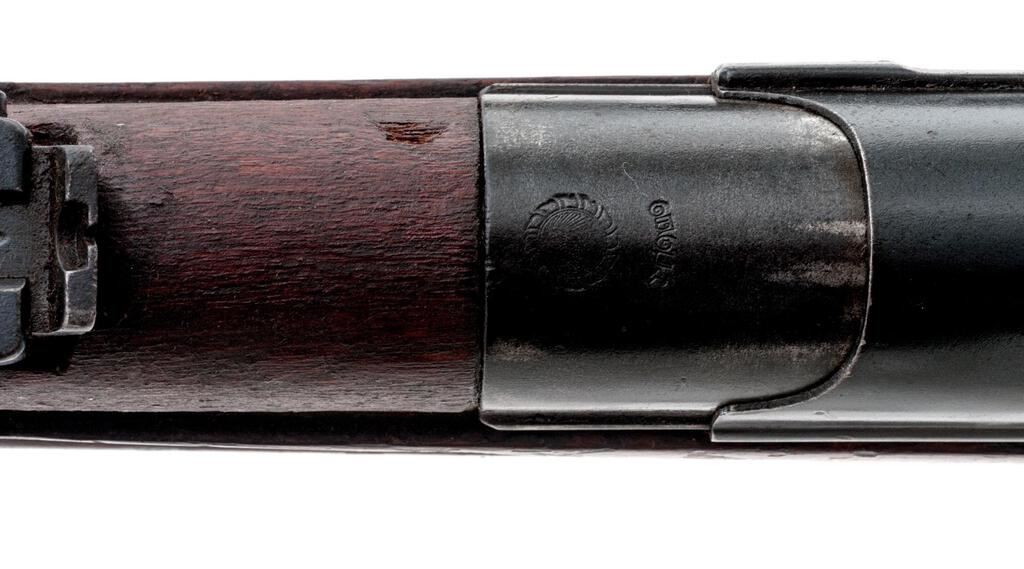 Siamese Type 46 Mauser Bolt Action Rifle, #2232, 8x50Rmm, 29.8" barrel, blued finish, hardwood stock set, inverted "V" front sight and adjustable tangent rear sight. An excellent condition sliding steel dustcover and a good condition spring steel muzzle cover are attached. Cleaning rod is mounted under the barrel but will not screw fully into position. Marked on top of receiver ring with the crest of King Rama VI over model type. Thai character serial number on rear receiver bridge. Condition overall is good with the metal retaining approx. 80% finish, showing rust to the rear sight and patina to the magazine floorplate and along the barrel wood line. Hand guard appears to be a replacement, and there is a small crack to the right-side forend below the rear sight. Wood is good otherwise with new and old bruises to the dark finish. Action operates smoothly, bore is poor with barely visible rifling. No visible import marks. Est.: $500-$700. (C&R)