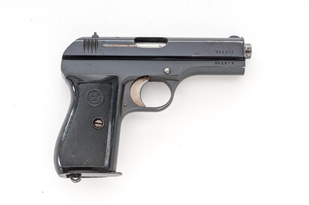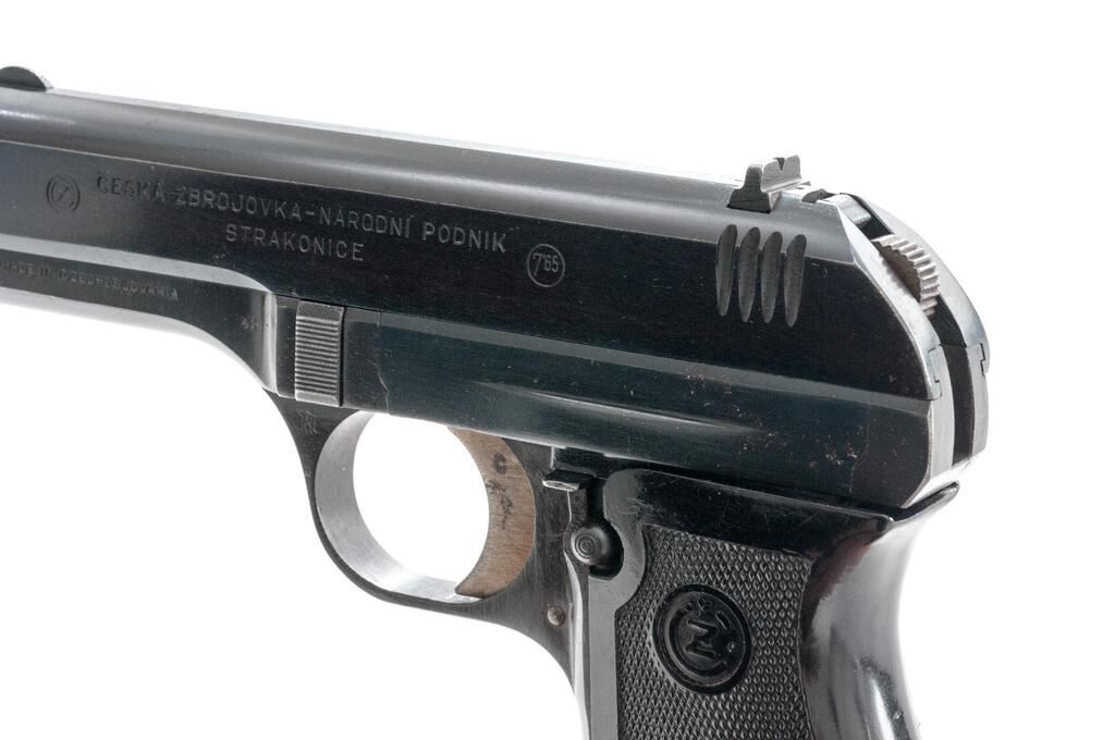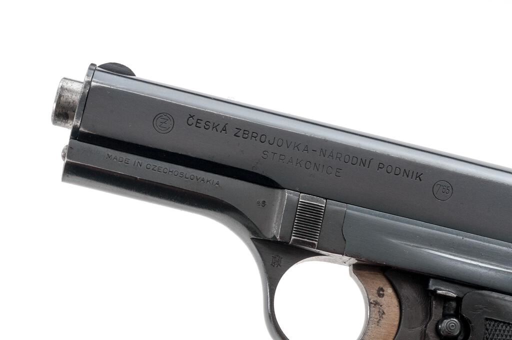 Czech Model CZ-27 Semi-Automatic Pistol, with Holster and Extra Magazine, #591972, .32 ACP cal., 3.9" barrel, blued finish, checkered one-piece black plastic grip with CZ logos on each side; blade front sight and drift adjustable rear sight with "V" notch. Pistol is marked on left-side slide with "(CZ logo)/CESKA ZBROJOVKA-NARODNI PODNIK/STRAKONICE". Left-side frame stamped "MADE IN CZECHOSLOVAKIA" and "48". There is a "(lion)N" proof stamp in the left-side front trigger guard web. One magazine is unmarked in very good condition, the other magazine is marked "P.Mod.27"and has a bent floorplate, otherwise good. Brown leather holster is marked on inside flap with a blurred ink stamp. A shoulder strap was removed from the rear flat. Holster condition is good with the dark pliable leather showing scratches and impressions to the surface. Pistol has matching numbers on frame and slide. Condition overall is very good with the metal retaining about 85% finish, showing areas of frosting to the frame, slide, and extractor. The straw-colored hammer and trigger show dark toning and some patina. Grip shows chips, scratches, and handling marks to the finish, otherwise good. Action operates smoothly, bright bore is excellent with well-defined rifling. No visible import marks. Est.: $500-$750. (C&R/PPT)