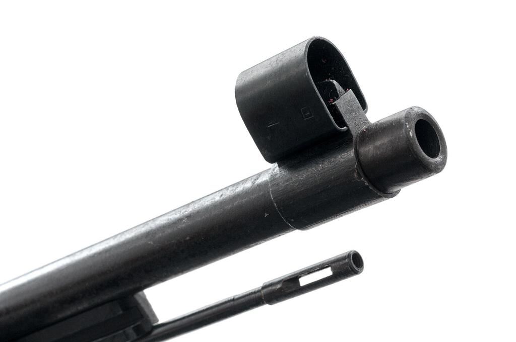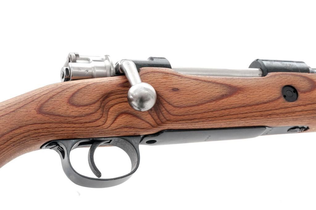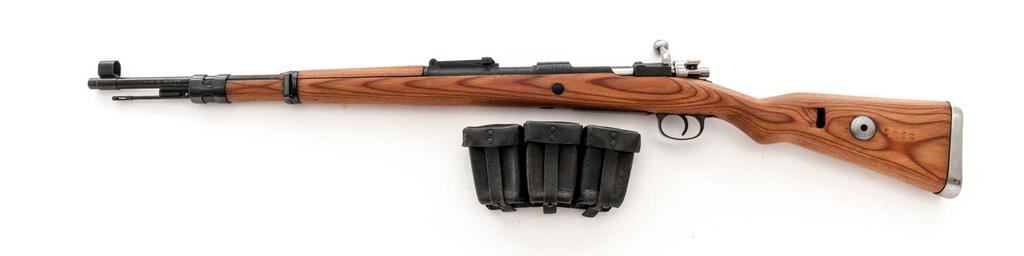Mitchell's Mausers Kar98k Bolt Action Rifle, #8816M, 8x57mm, 23.62" barrel, blackened finish, laminated stock set with cupped buttplate, inverted "V" front sight with attached hood and adjustable tangent rear sight. A very good condition three-cell black leather pouch marked "0/0585/0035", cleaning cord, and owner's manual are included. Marked on top of receiver ring with a waffenampt stamp over "dou 43", along with a stamped asterisk symbol. Left side receiver rail marked "Mod.98". There are intact "(eagle)/(swastika)" stamps on the left side of the receiver ring and barrel, and 3 faint stamps on right-side buttstock. Matching numbers have been recently applied to the bolt handle, trigger guard/floorplate, and left-side buttstock. Condition overall is very good as reconditioned, with the metal retaining over 95% of the dark refinish, which was applied over old frosting on the receiver and barrel. Bolt assembly has been polished bright. There is a spliced repair to the top of the hand guard. Wood has been sanded smooth, now very good, with darkening around the receiver. Action operates smoothly; bore has light frosting forward of the chamber, otherwise very good with very good rifling. Import stamped on left side of barrel. Est.: $600-$800. (C&R)