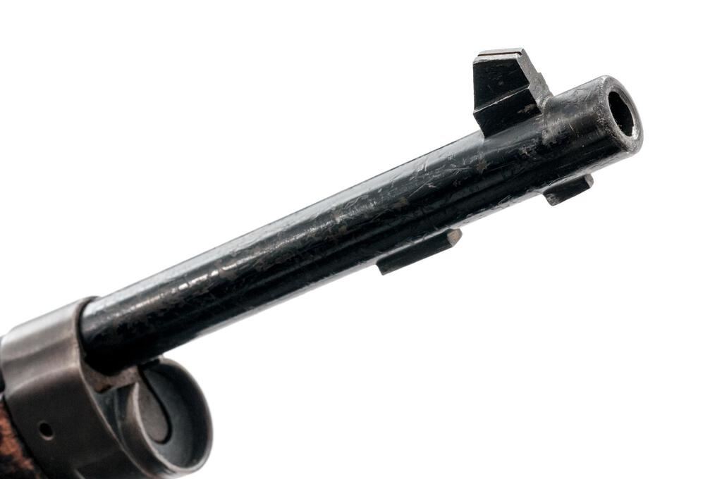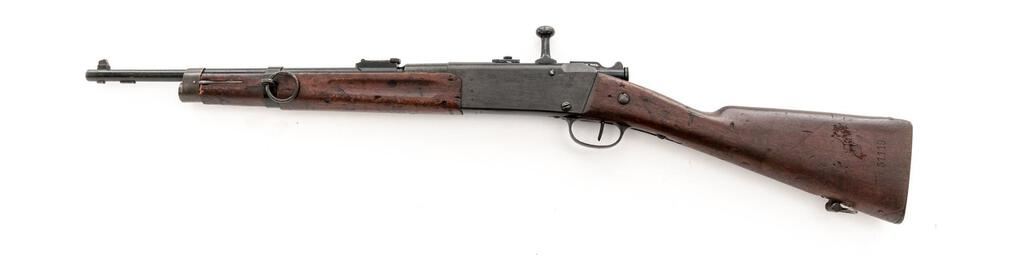 French Model 1886 M93 R35 Lebel Bolt Action Carbine, #51119, 8x50Rmm, 17.7" barrel, black-painted finish, two-piece hardwood stock, blade front and adjustable rear folding leaf Berthier type sights. Marked on left-side receiver "MANUFACTURE D'ARMES Chatellerault" and "MLE 1886 M93 R35". Right-side barrel shank marked "MA C 1938". Matching numbers on magazine, buttstock and forend. Mismatched number on bolt handle. Condition overall is very good. The black-painted finish has been removed from the receiver, now retaining about 40%, with the balance showing overall flaking and scratches. There is a crack to the right-side buttstock forward of the wrist and a carved area on the left side, otherwise the wood is good showing dents and handling marks to the dark finish. Action operates smoothly; bore has slight darkening in the grooves, otherwise bright with very good rifling. No visible import marks. Est.: $600-$800. (C&R)