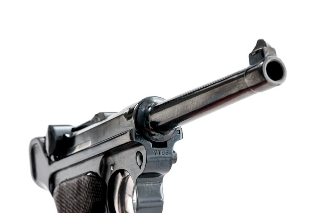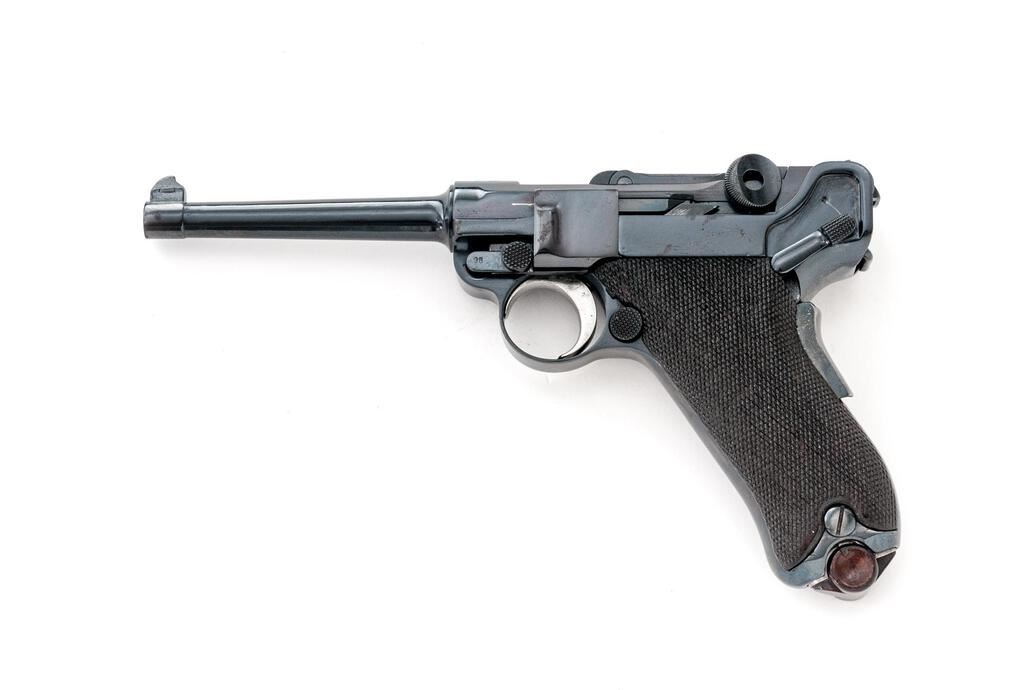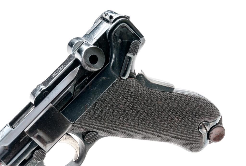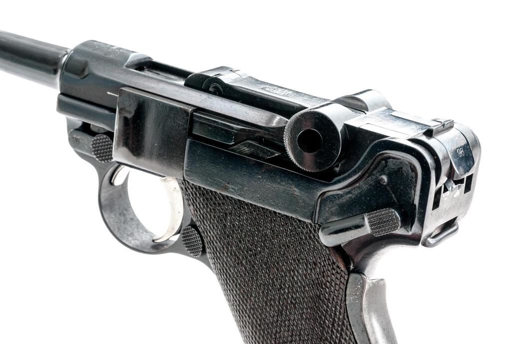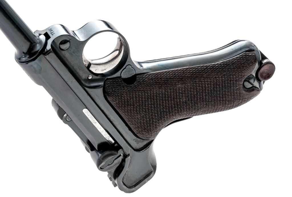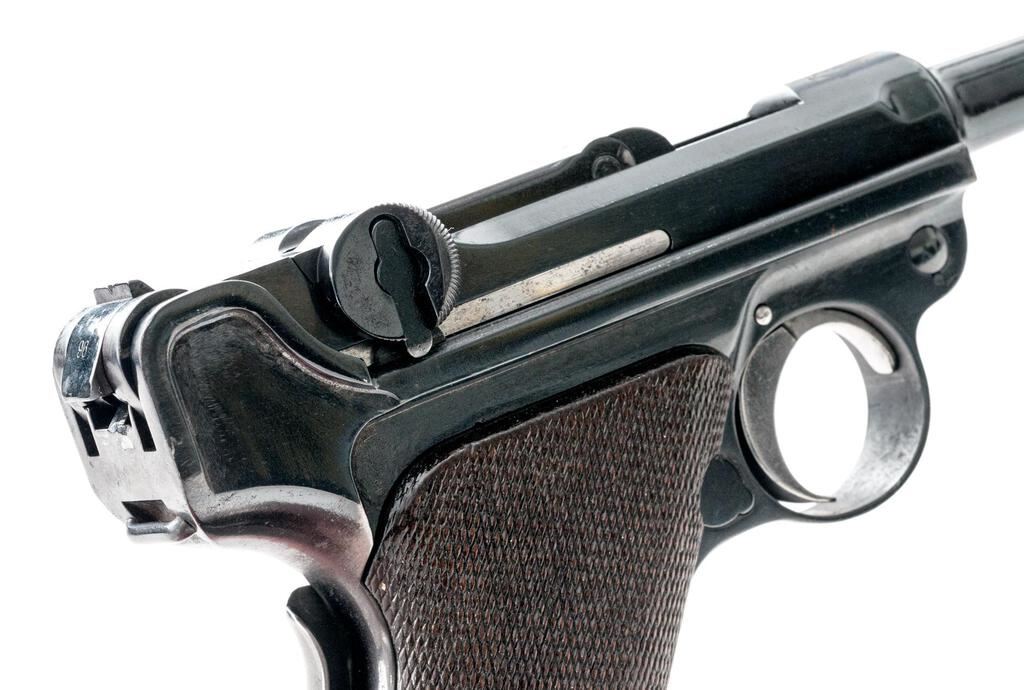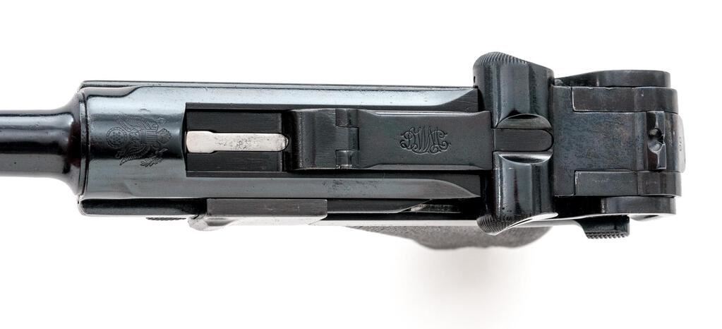 1900 American Eagle Commercial DWM Luger Semi-Automatic Pistol, #7796, 7.65mm Luger (.30 cal. Luger), 4.75" barrel, blued finish, dished toggles, DWM marked center toggle link, American eagle on top of chamber, grip safety, no stock lug, drift adjustable saw tooth type front sight, integral fixed rear sight with small "v" notch, all visible numbers matching, checkered wood grips, and one nickel-plated magazine with an unmarked wood base. No "Germany" or "Made in Germany" markings. Condition is good as refinished, with a high-polished salt blued finish, showing heavy polishing to the various parts, some wear and light pitting on the sideplate, left side of frame above the grip, wear on the front and rear grip straps, wear and thinning to the grip safety, some grinding and polishing marks not removed inside the rear frame ears, and wear lines from firing. Trigger, extractor, and ejector spring have been chrome plated and show minor old pitting under the plating. Action, hold open, and safeties function properly; bore is frosted overall with definable lands and grooves. Grip safety feels sticky and may need some cleaning or lubrication. Grips have been varnished and stained almost black, with light gouges and dings, flattening to the diamonds, and left grip is missing a small piece by the safety lever. Grip screws show light wear to the tops with clean slots. Magazine shows light wear from use on the body with minor spotting. Wood base has a tight hairline crack, a small ding in one roundel, and has been lightly varnished. Est.: $700-$1,000. (C&R/PPT)