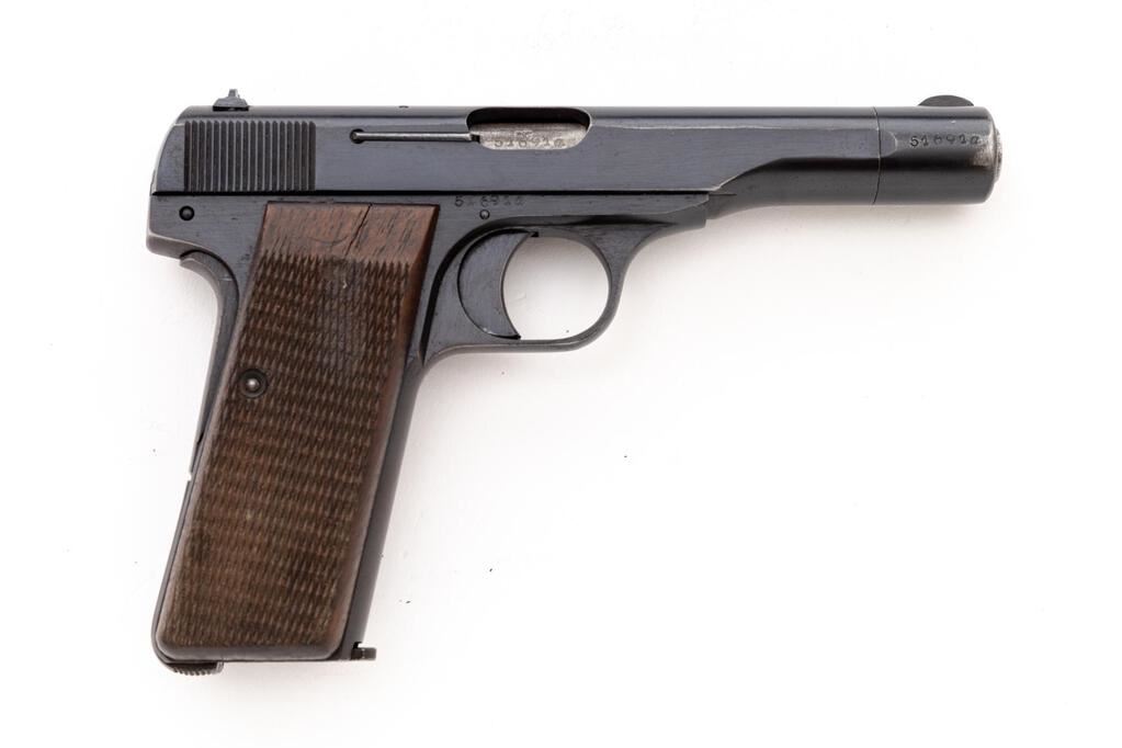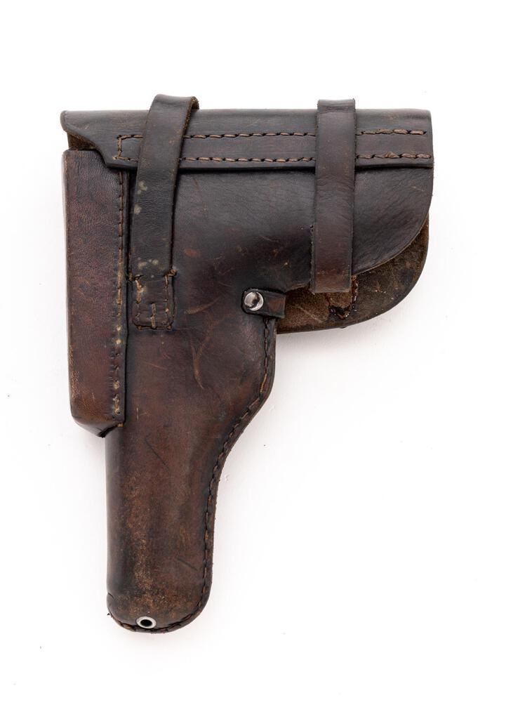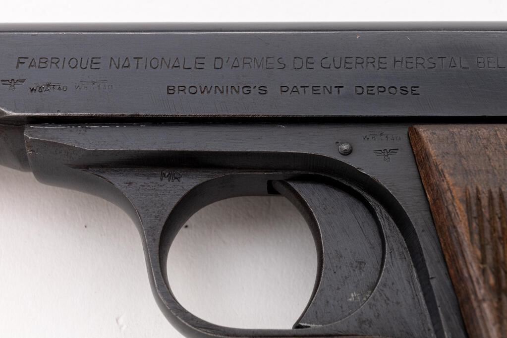 WWII German Marked Browning Model 1922 Semi-Automatic Pistol, with Holster, #51691a, .32 ACP cal., 4.4" barrel, blued finish, Nazi eagle firing proofs on frame, slide, and barrel; "(eagle)WaA140" waffenampts on slide and frame, slide marked with Fabrique National address and Browning patent info, all visible numbers matching, thin blade type fixed front sight and drift adjustable fixed rear sight with "V" notch, grip safety, magazine safety, checkered wood grips, two (2) blued steel magazines marked with FN, FN logo, and 7.65. Includes a dark brown German dropping holster with ink stamp on underside of top flap that reads "Nur fur Lange Browning-Pistol, Kal. 7.65", and a "Weimar(eagle)2" stamp on the outside of the top flap. Condition is good retaining approx. 75%-80% original blued finish, with wear at the muzzle sides, tops of the sights, minor rust spots around the rear sight on the slide. Trigger guard front has light freckling, the front and rear grip straps are thinning and fading to brown, the barrel is in the white and shows age graying and light rust at the chamber area. Action and safeties function properly, bore is bright and shiny. Grips show age, darkening and light wear, with the right grip having a large dent, small gouge, and a hairline crack at the top. Magazine in the gun shows a dark matte finish with wear and lines from use; the other magazine shows wear and lines from use, and freckling on both sides and the base. Holster shows age and darkening to the leather, scuffs, scratches, small gouges, and soiling. Est.: $500-$700. (C&R/PPT)