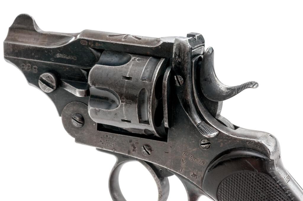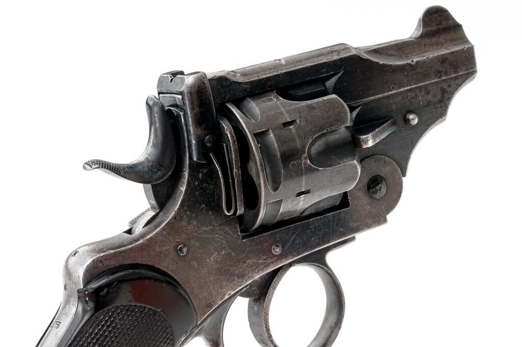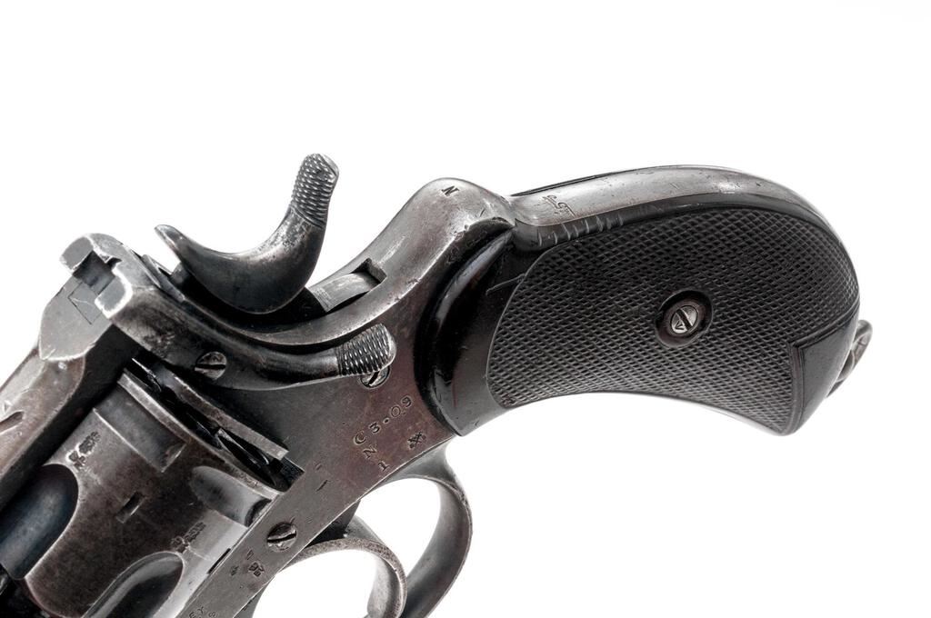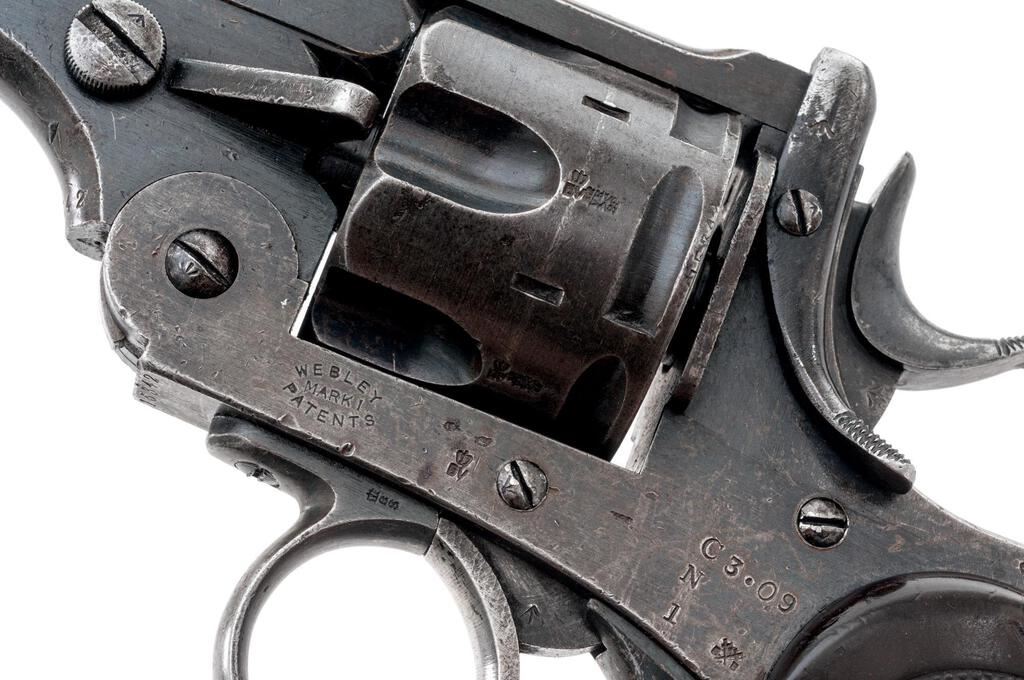 Modified British Webley Mark 1 Double Action Revolver, with Holster, #15342, .45 ACP cal., 2.4" barrel, blued finish, black plastic grips, blade front sight and fixed "U"-notched rear sight. Marked on left-side frame "WEBLEY PATENTS" around "MARK 1". Left-side barrel top strap stamped with Victorian proof and view stamps. Royal Navy issue "N" stamp on top of grip swell and on left side of frame. Large "Broad Arrow" symbol engraved into top of barrel strap. Matching numbers on frame, barrel, and (partially) on edge of cylinder. Revolver has been modified by milling off the rear of the cylinder to chamber the .45 ACP cartridge. Barrel has been shortened and the top rib cut to accept the front sight. Condition overall is good as modified, with the metal retaining approx. 50% finish showing dents and areas of patina. Right-side grip has been repaired on the bottom edge, otherwise the grips are good, showing fading, chips, and flattening to the checkering. Action locks up tight and operates smoothly; bright bore is very good, chambers are clean and bright. "ENGLAND" import stamp on left side of barrel. The Canadian made holster is partially ink stamped on the inside flap "ZL&T.LTD/1943/C Broad Arrow" stamp. It has been cut down to fit the modified revolver. Holster condition is very good with a bright color, showing light stains to the exterior. Est.: $600-$900. (C&R/PPT)