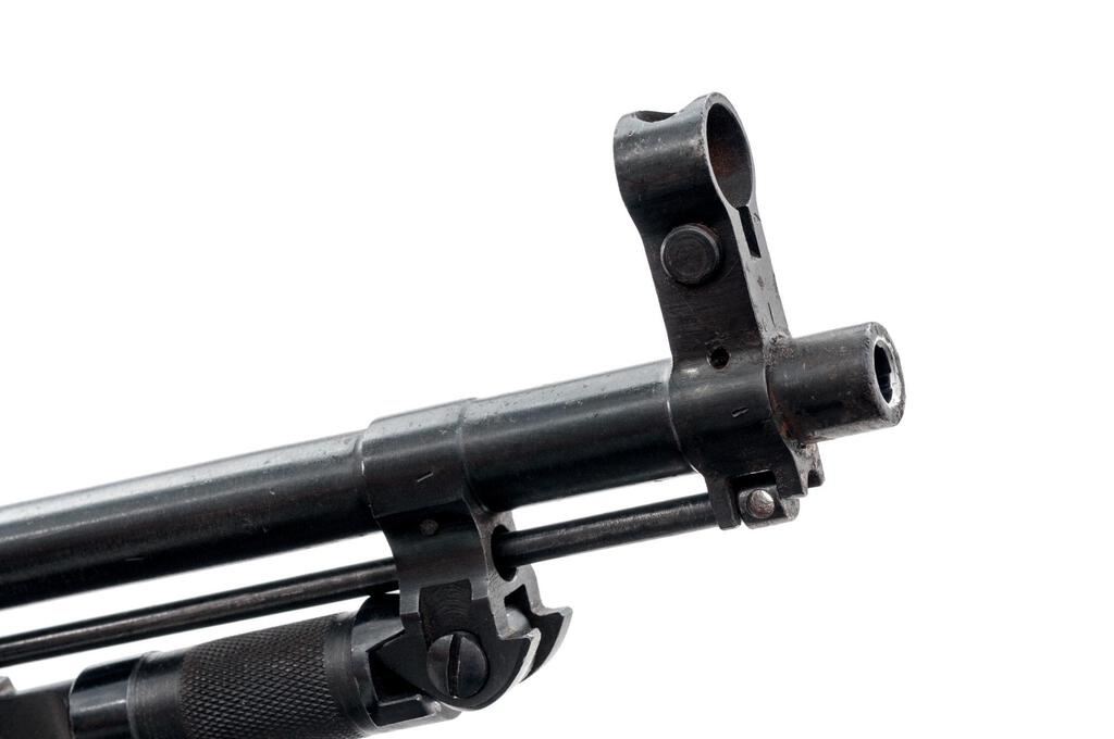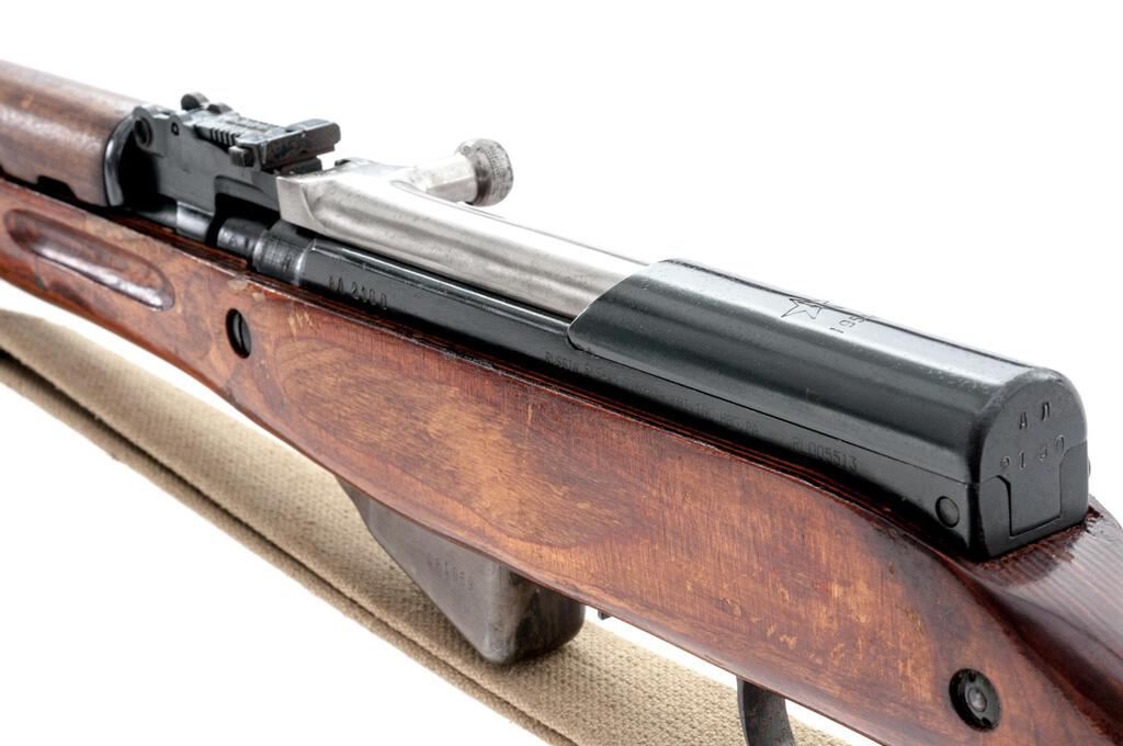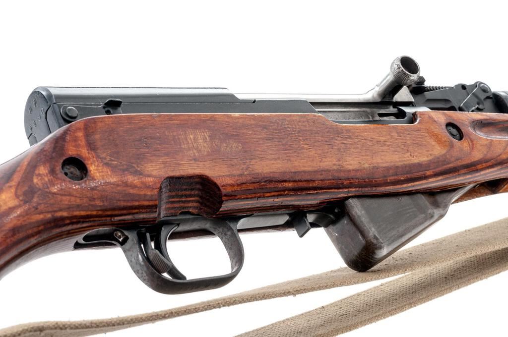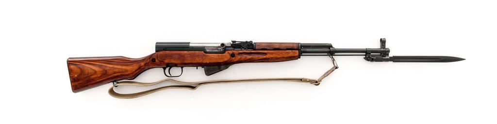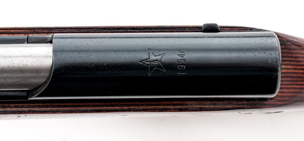 Rare Tula Arsenal Soviet SKS Semi-Automatic Carbine, with Folding Bayonet, #RL005513, 7.62x39mm, 20.5" barrel, blued finish, bright bolt carrier, laminated stock, hooded post front sight and adjustable leaf rear sight. Cleaning rod is mounted under the barrel, and the cleaning kit is inside the butt trap. A good condition Soviet cotton sling is attached. Bayonet blade has dark finish. Marked on top of receiver cover with the Tula Arsenal fletched arrow inside a five-pointed star over "1954r". Matching original Cyrillic serial number (AN2180) on bolt carrier, receiver cover, trigger guard, and (crudely scratched) on the left side of the re-numbered buttstock. Magazine is marked "464069" on the left side and appears to be a replacement. Condition overall is very good with the metal retaining approx. 80% finish, showing most of the bluing removed from the magazine and rust spots on the exposed barrel and trigger guard. Hand guard has been sanded smooth and left unfinished, now in good condition. Stock is very good showing areas of flaking to the dark shellac finish along with handling marks and scratches. Action operates smoothly, bright bore is excellent with sharp well-defined rifling. Bayonet is excellent and locks firmly into position. Import marked on left side of receiver. Est.: $800-$1,100. (C&R)