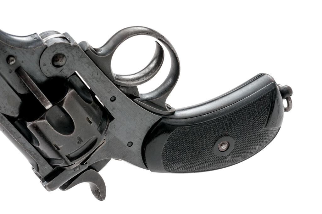 British Royal Navy Marked Webley Mark II Double Action Revolver, #51262, .45ACP cal., 4" barrel, blued finish, black plastic checkered grips, blade front sight and fixed "U"-notched rear sight. A round lanyard ring is attached to the bottom of the grip frame. Marked on left-side frame "WEBLEY/MARK II/PATENTS". Left-side barrel strap stamped with final proof mark, War Dept. ownership mark, and Birmingham view mark. "N/2" has been stamped on the rear of the grip frame indicating Royal Navy ownership, and a large "Broad Arrow" has been engraved into the top of the grip strap. Matching numbers on frame, barrel, and cylinder. Revolver has been importer converted to .45 ACP caliber by "shaving" off the rear of the cylinder. Condition overall is very good with the metal retaining approx. 80% finish, showing small handling marks across the surface. Right-side grip has a chip at the base, otherwise both are good with a few areas of flattening to the checkering. Action locks up, cycles, and extracts smoothly; bore has areas of pitting forward of the lead, otherwise good with good rifling; chambers have dark areas that may clean better, otherwise good. Birmingham export proof marks stamped on left side frame and barrel. Est.: $500-$700. (C&R/PPT)