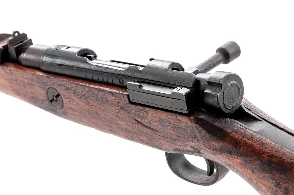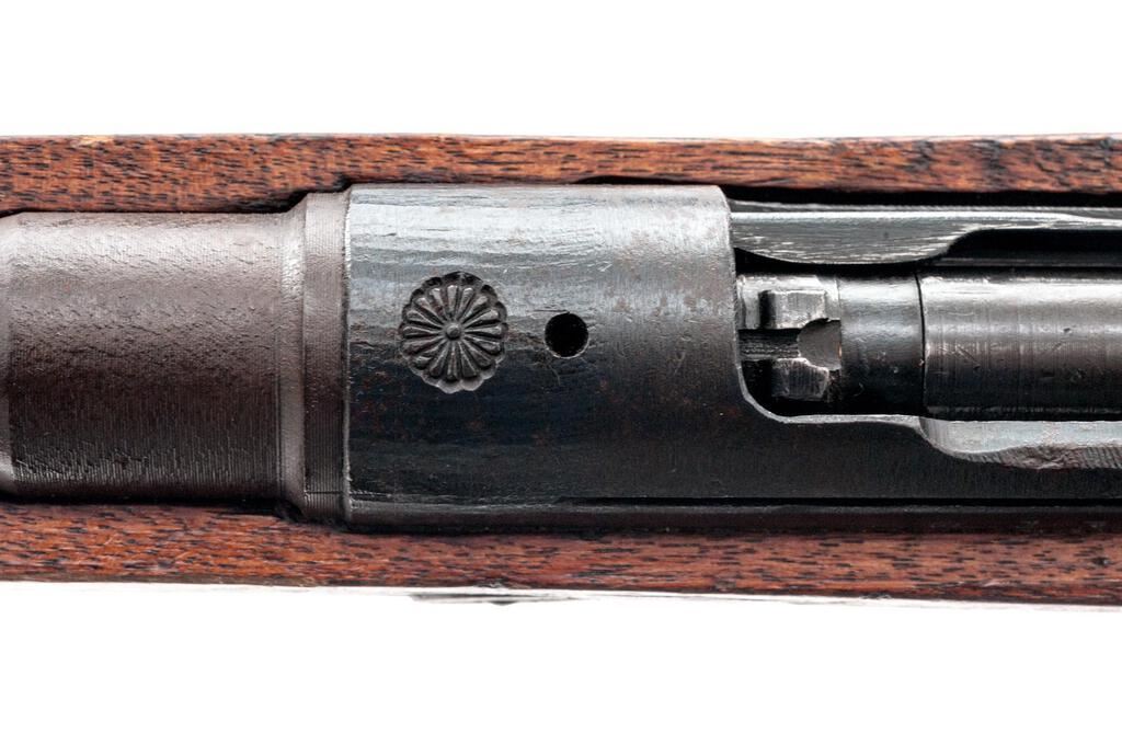 Last Ditch Japanese Type 99 Arisaka Bolt Action Rifle, #13821 ,7.7x58mm, 25.5" barrel, blued finish, two-piece hardwood stock, inverted "V" front sight without protectors and fixed rear sight with aperture. Rifle is Last Ditch type with wooden buttplate, simplified bolt handle, and forend without provision for cleaning rod. Marked on top of receiver ring with intact Mum crest but without model number. Stamped on left-side receiver with an Eighth Series mark and the symbol for the Nagoya Arsenal. Matching numbers on bolt handle and extractor. Condition overall is good with approx. 50% of the metal frosted with a rust patina. Wood is good with scattered chips, dents, and scratches to the dark finish. Action functions, but the cocking piece fits loosely and must be manually aligned to operate smoothly; bore is good with good shallow rifling. Est.: $400-$600. (C&R)