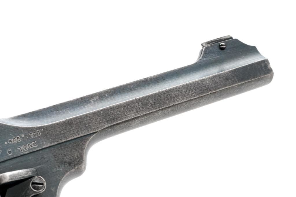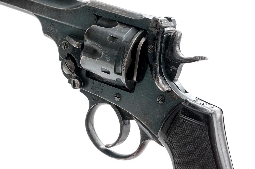 New Zealand Issued British Webley Mark VI Double Action Revolver, #425741, .45 ACP cal., 6" barrel, blued finish, black plastic grips, blade front sight, dovetail insert is missing from rear sight. Marked on left-side frame "WEBLEY/MARK VI/PATENTS/1918". Left-side barrel strap is stamped "MARK VI" behind 18 in service, and Birmingham proof and view stamps. Sold out of service opposing arrows are stamped on left-side barrel forward of holster guides. New Zealand issue marks "NZ/11/19/350" are stamped on rear of frame. Matching numbers on frame, barrel, and cylinder. Revolver has been converted to .45 ACP cal. by shaving the rear of the cylinder and can be loaded using full or half-moon clips. Condition overall is very good with the metal retaining approx. 70% finish, showing darkening to the barrel and flaking to the painted stirrup release. Grips are good showing small chips and handling marks with overall flattening to the checkering. Action locks up, cycles, and ejects smoothly; bright bore is very good with very good defined rifling. London export proof marks are stamped on right side of barrel. Est.: $500-$700. (C&R/PPT)