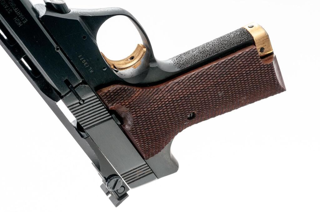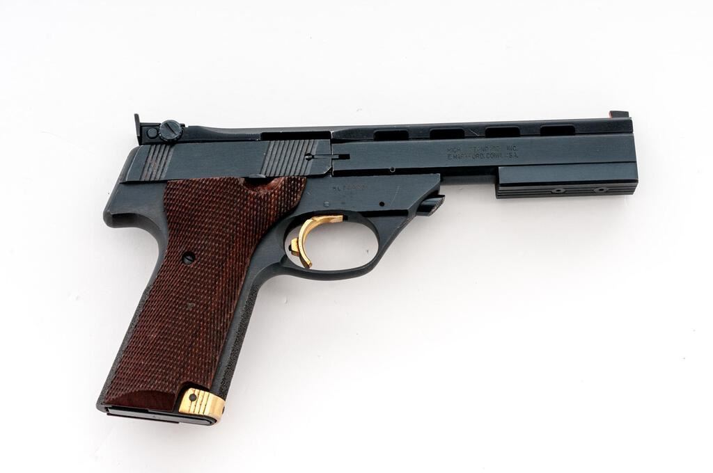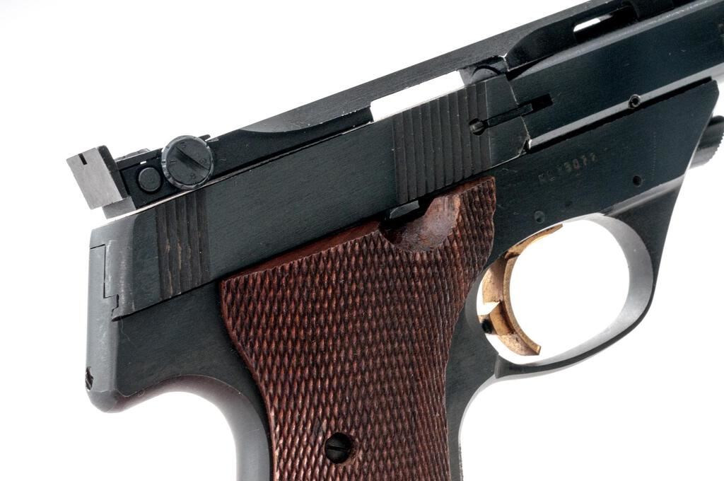Hi-Standard Victor Semi-Automatic Target Pistol, #ML73077, 5.5" barrel with a full-length ventilated rib, blade front and integral adjustable sights, blue finish, checkered walnut two-piece thumb rest grips, factory stippled front and rear straps, two (2) 10-rd. magazines, barrel weights, and push-button takedown. Frame is marked "VICTOR" on left side; right side of slide is marked "HIGH STANDARD INC./E. HARTFORD, CONN. U.S.A." Mfg'd 1980. Pistol is in fine overall condition retaining approx. 93%-95% factory blue finish, with light scratches and edgewear associated with carry and use. Factory grooved trigger, safety, and magazine release are finished in gold tone. Grips are very good with sharp checkering. Action is crisp, bore is good with defined rifling. Lot includes two (2) correct 10-rd. magazines. Est.: $500-$700. (Modern/PPT)