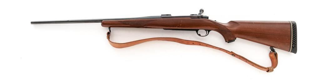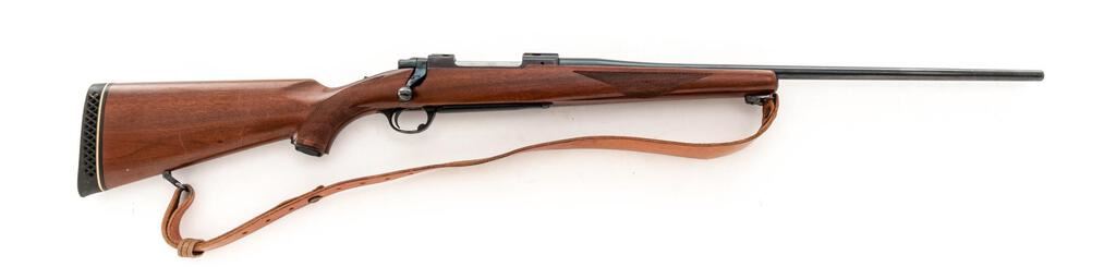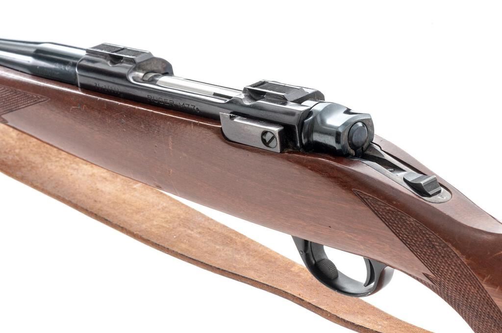 Ruger M77 Bolt Action Rifle, #75-36383, 7mm Rem Mag. cal., 24" barrel with no provision for sights, integral bases, tang-mounted safety, blue finish, checkered walnut one-piece pistol grip stock, with a ventilated rubber Whiteline recoil pad, sling swivels, and a period leather rifle sling. Mfg'd 1981. Rifle is in very good overall condition retaining approx. 90% factory blue finish, with light scratches, wear at the muzzle, some surface erosion, dried oil and such on the barrel. The small mars and marks are consistent with field use. Bolt is serialized to the rifle with a matching number. Checkered walnut stock is in good condition with intermittent scratches and mars from carry and use. Rifle features a desirable tang safety, and the ventilated rubber pad provides a 14-1/4" LOP. Action is crisp, bore is very good with well-defined rifling. Est.: $500-$750. (Modern)
