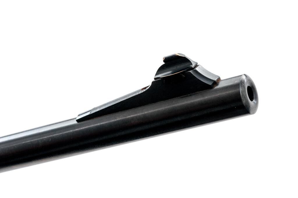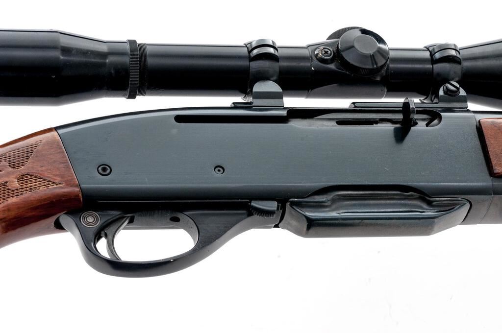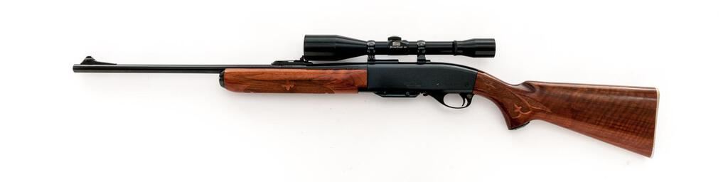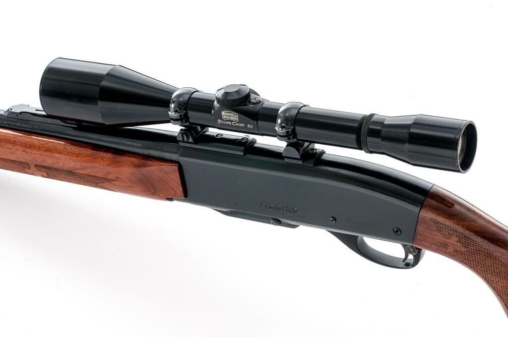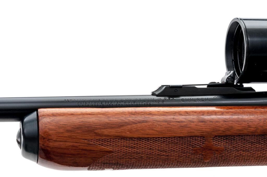 Remington Model 742 Woods Master Semi-Automatic Rifle, #265422, 6mm Rem. cal., 22" barrel, brass bead ramped blade in the factory dovetail front and "U"-notched adjustable rear sights, blue finish, checkered wood two-piece pistol grip stock with a checkered aluminum buttplate, 4-rd. detachable box magazine and two-piece base, rings, and a Bushnell Scope Chief 6x fixed-power rifle scope in gloss black with a fine wire reticle providing clear optics. Mfg'd 1967. Rifle is in fine overall condition retaining approx. 94%-95% original blue finish with light handling and storage marks only. There are some small marks on the trigger guard. Checkered wood stock is very good with light scratches and nice figure in the buttstock, ending with a checkered aluminum buttplate providing a 13.25" LOP. Action functions smoothly, bore is very good. Est.: $600-$800. (C&R/PPT)