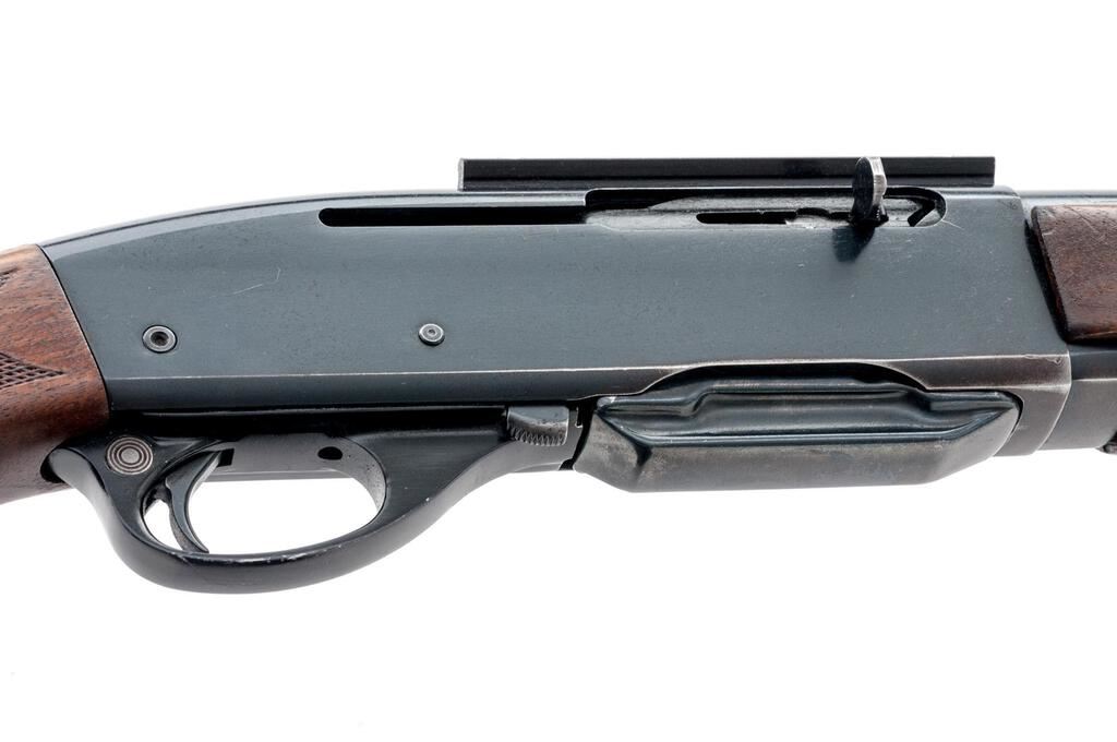 Remington Model 742 Woods Master Semi-Automatic Rifle, #219527, 6mm Rem. cal., 22" barrel, ramped blade in the factory dovetail front and "U"-notched adjustable rear sights, blue finish, checkered wood two-piece pistol grip stock with a checkered aluminum buttplate, 4-rd. detachable box magazine and sling eyes. Mfg'd 1966. Rifle is in very good to near fine overall condition retaining approx. 90% thinning original blue finish, with wear at the muzzle, light scratches and edgewear. A Weaver one-piece base has been added during the period of use. There is some loss of finish on the left side of the receiver, light scratches, and scrapes on the trigger guard. Stock is very good with some flattening of checkering and light marks, ending with a checkered aluminum buttplate providing a 13.25" LOP. Action functions well, bore is good. Est.: $500-$750. (C&R/PPT)