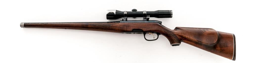 Steyr Arms (Mannlicher) Model L Bolt Action Carbine, #61787, .22-250 cal., 20" cold hammer-forged barrel with no accommodation for sights, blue finish, checkered wood one-piece full-length Mannlicher style pistol grip stock with cheekpiece and a solid rubber Steyr marked recoil pad, 5-shot rotary magazine and butter knife bolt handle with matching serial number. Carbine is topped with two-piece claw mounts and rings, with an unmarked variable-power scope in gloss black with a German #4 reticle with clear crisp optics. Scope shows considerable wear and has been refinished but appears to be quality glass. Carbine is in very good overall condition with thinning of finish and bare metal showing in several spots on the hammer-forged barrel. Receiver retains the majority of the factory blue with an import mark on the right front ring and the rear of the receiver marked "MADE IN AUSTRIA". There is finish loss on the butter knife bolt handle. The skip-line checkered wood Mannlicher stock is good with dents and compressions consistent with field use; there is some flattening of the checkering evident. Bore is good and action is smooth on this desirable Steyr Carbine. Est.: $1,000-$1,200. (Modern)