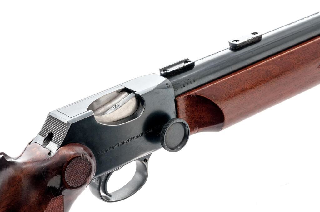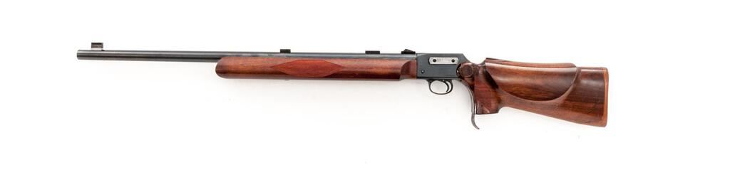 Birmingham Small Arms (BSA) Martini International MK II Single Shot Rifle, #E463, .22 LR cal., 29" round barrel, blued finish, smooth two-piece hardwood stock with diamond pattern checkering, and extended lever. Condition is very good overall. Metal surfaces showing minor handling marks, case colors on lever have faded. Wood with minor scratches and light impressions. Front and rear sights have been removed but bases remain. Forearm equipped with a 4.5" rail with 5 mounting holes. Mounting base for additional shell holder located on the left side of the receiver. Length of pull is 13" including a checkered solid wood buttplate, OAL is 43.5" and the rifle weighs 11.85 lbs. Bore is bright with well-defined rifling. Est.: $600-$800. (C&R)