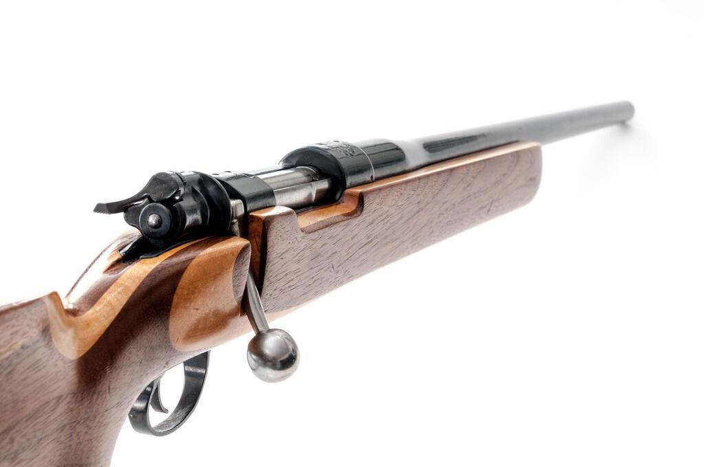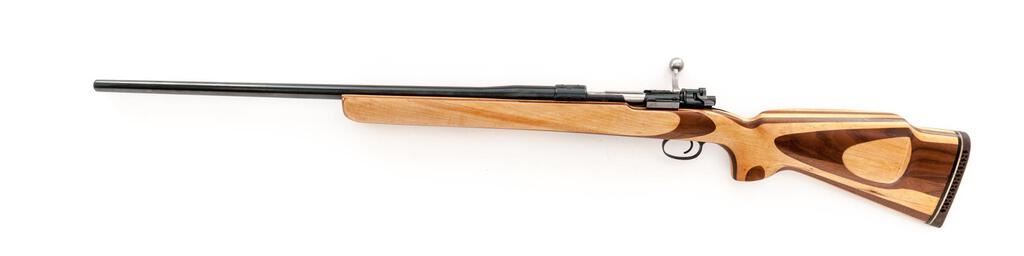 Custom BRNO VZ-24 Bolt Action Sporting Rifle, #D52923, .25-06 cal., 26" medium heavy barrel with no accommodation for sights, flag safety, bolt in the white, blue finish, smooth laminate wood one-piece pistol grip target stock with a Whiteline ventilated rubber recoil pad. Rifle is in fine overall condition with the custom barrel retaining approx. 96%-97% blue finish. Receiver retains a significant amount of blue with a Czech crest on the front ring. Front and rear rings have been drilled and tapped and left vacant. Trigger guard has been slimmed. The smooth laminate wood stock is very good with light scratches and handling marks, ending with a ventilated rubber recoil pad providing a 14.25" LOP.  Action works well, bore is very good with clearly defined rifling. Est.: $400-$600. (Modern)