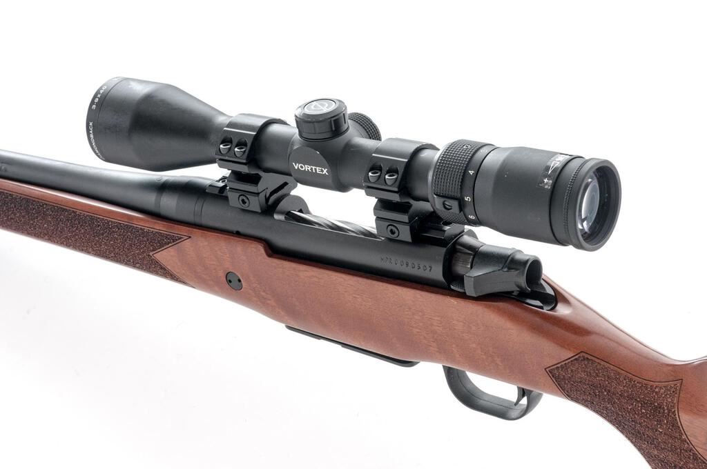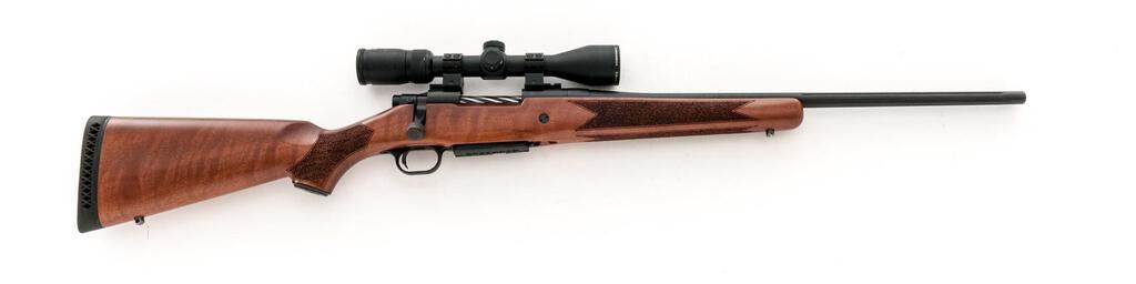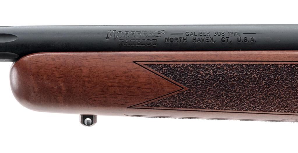 Mossberg Patriot Bolt Action Sporting Rifle, #MPR0090507, .308 Win. cal., 22" fluted barrel with no accommodation for sights, fluted bolt, matte blue finish, stippled walnut one-piece pistol grip stock with cheekpiece and ventilated rubber recoil pad, detachable 5-rd. box magazine, sling studs, Weaver bases and rings, with a Vortex Diamond Back 3-9x40 rifle scope in matte black with a BDC (Bullet Drop Compensator) reticle. Scope has small mars and scratches on the exterior with clear, crisp optics. Rifle is in excellent overall condition showing little use with minor handling and storage marks. Stippled walnut stock is near excellent showing light handling marks with a crossbolt added for stability. Buttstock ends with a Mossberg marked ventilated rubber recoil pad providing a 13.75" LOP. Action functions smoothly, bore is very good with crisp rifling. Est.: $400-$600. (Modern)