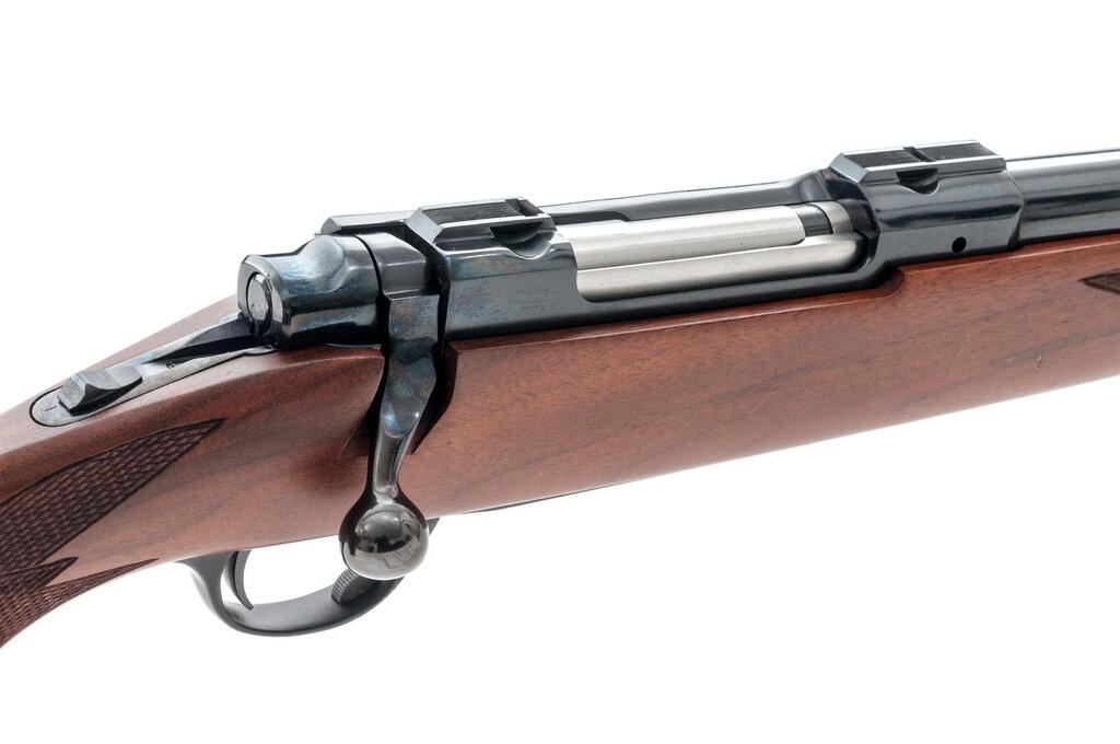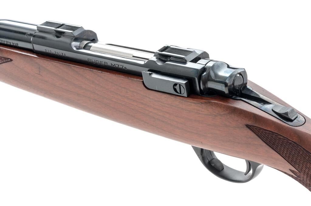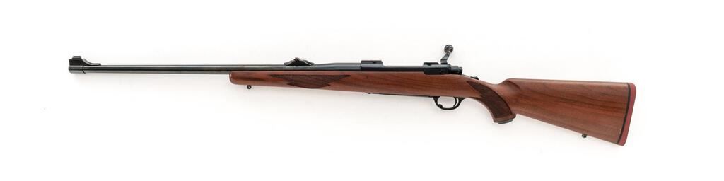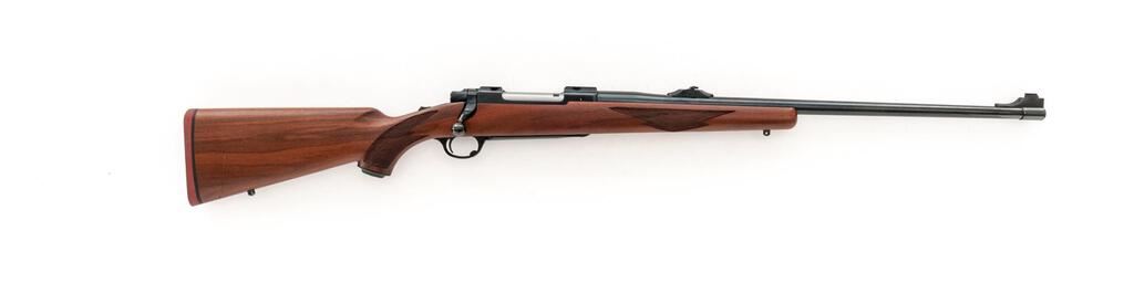 Ruger M77RS Bolt Action Sporting Rifle, #770-78174, .338 Win. Mag. cal., 24" barrel, banded ramped blade front and folding semi-buckhorn rear sights, tang-mounted safety, blue finish, integral scope bases, checkered walnut one-piece pistol grip stock with sling eyes and a red solid rubber Ruger marked recoil pad. Mfg'd 1986. Rifle is in near excellent overall condition retaining 98%-99% factory blue finish with light handling marks. Bolt is etched with the matching serial number. Checkered walnut stock is very good with small mars, scratches, and compressions. Buttstock ends with a red solid rubber recoil pad providing a 13.75" LOP. Action is smooth, bore is very good with well-defined rifling. Est.: $600-$800. (Modern)