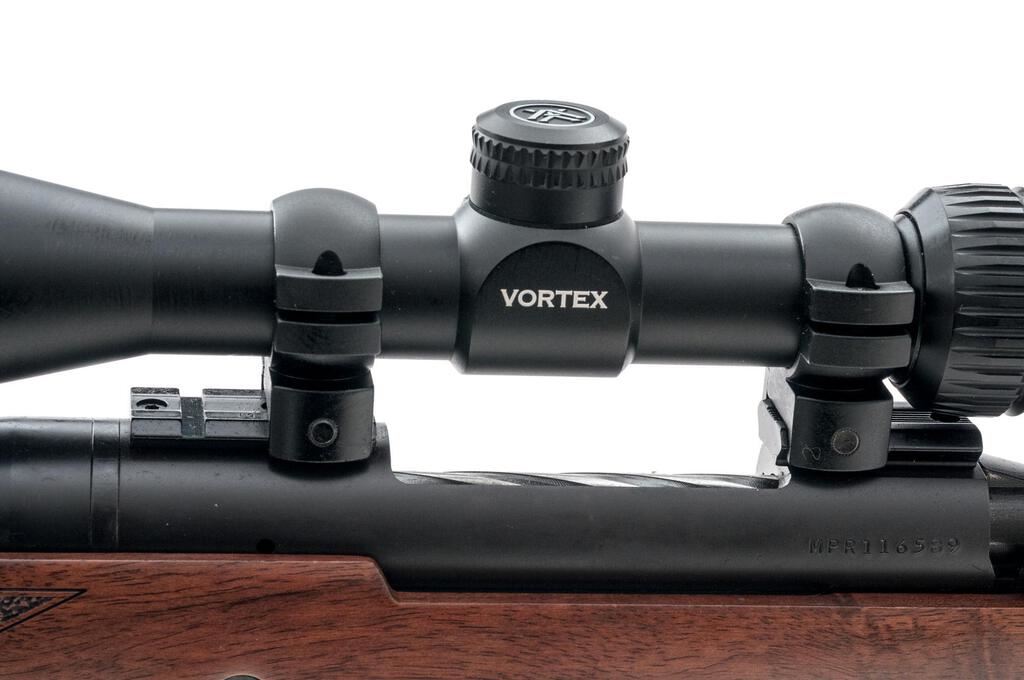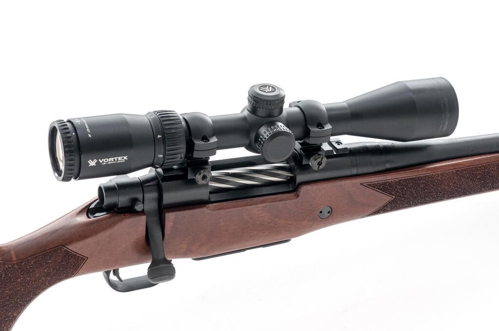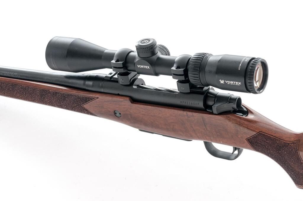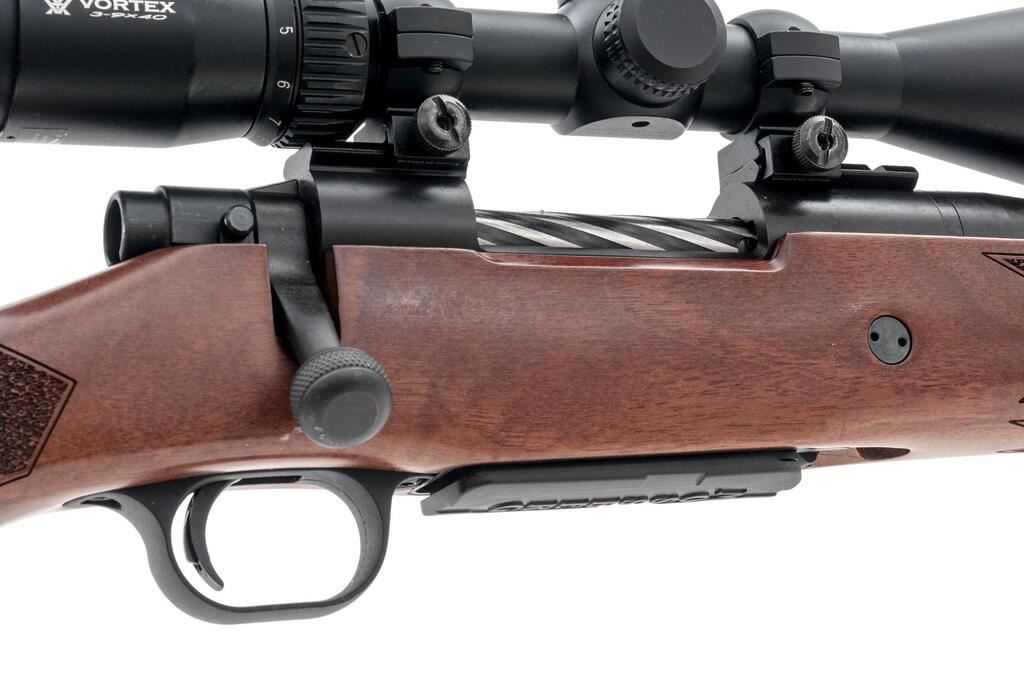 Mossberg Patriot Bolt Action Sporting Rifle, #MPR116589, .243 Win cal., 20" fluted barrel with no accommodation for sights, fluted bolt, matte blue finish, stippled walnut one-piece pistol grip stock with cheekpiece and ventilated rubber recoil pad, detachable 5-rd. box magazine, sling studs, Weaver bases and rings with a Vortex Crossfire II 3-9x40 rifle scope in matte black with a BDC (Bullet Drop Compensator) reticle. Scope shows clear, crisp optics. Rifle is in excellent overall condition showing little use with minor handling and storage marks. Walnut stock is very good with small mars and scratches, with a crossbolt added for stability. Buttstock ends with a Mossberg marked ventilated rubber recoil pad providing a 13.75" LOP. Action functions smoothly, bore is very good with crisp rifling. Est.: $400-$600. (Modern)