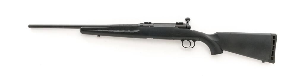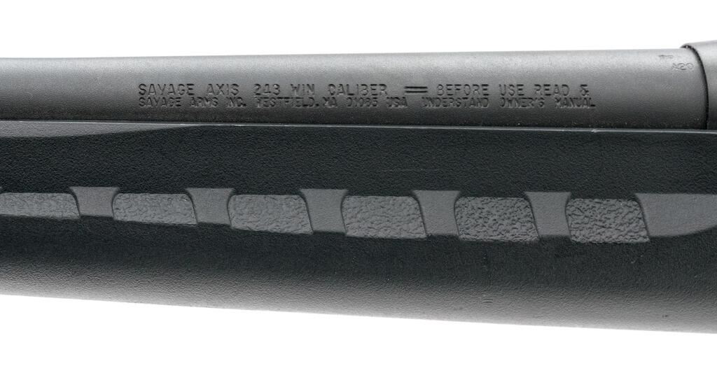 Savage Axis Compact Model Bolt Action Sporting Rifle, #H606744, .243 Win. cal., 20" barrel with no accommodation for sights, tang-mounted safety, matte blue finish, matte black synthetic one-piece pistol grip stock with a ventilated rubber recoil pad, sling eyes and 4-rd. detachable magazine. Rifle is in near excellent condition showing little use. Receiver is factory drilled and tapped with Weaver two-piece bases added. The synthetic stock is very good with a ventilated rubber recoil pad providing a 13.25" LOP. Bore is very good with defined rifling and the action works well on this Savage youth model Sporter. Est.: $200-$400. (Modern)