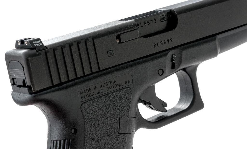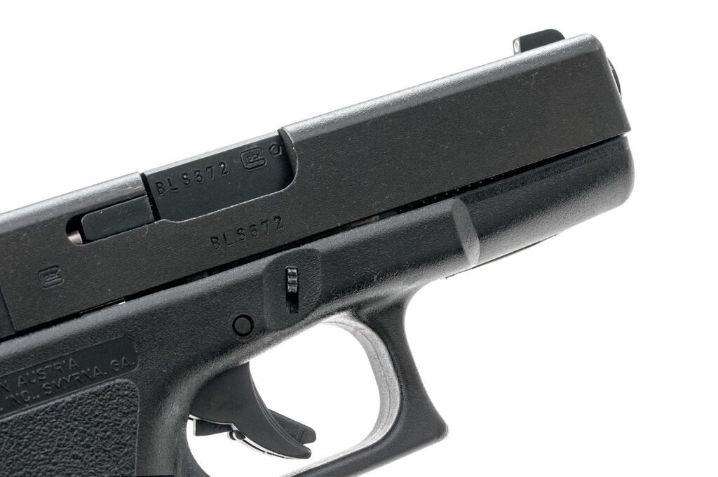 Glock Model 19 Gen 2 Semi-Automatic Pistol, #BLS672US, 9mm, 4.01'' barrel, matte black slide, black polymer frame, three-dot Trijicon night sights, with one 10-rd. Glock magazine. In non-matching black hard plastic Glock case. Condition is near excellent showing minimal handling and range use, there is a very light scratch showing on the left forward portion of the frame. Action is tight and smooth, excellent mirror bright bore. Night sights do not glow. Est.: $400-$600. (Modern/PPT)