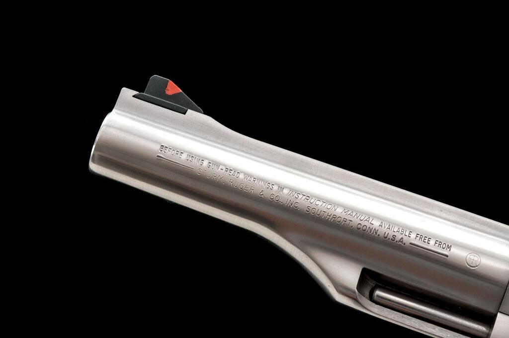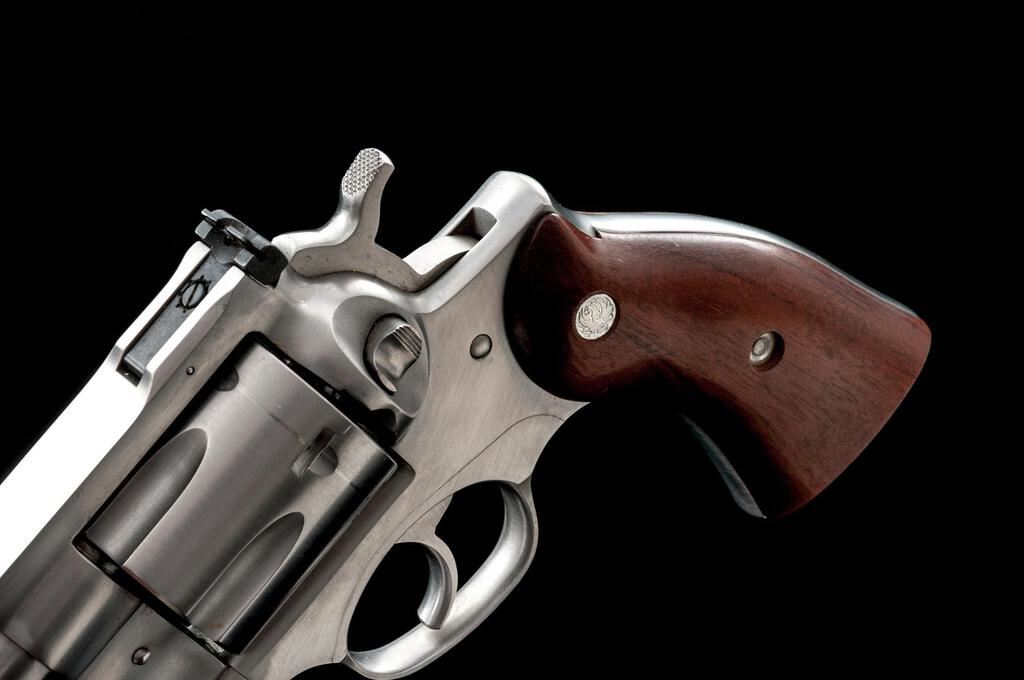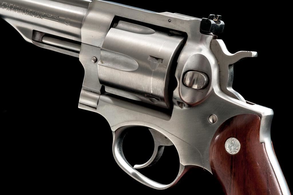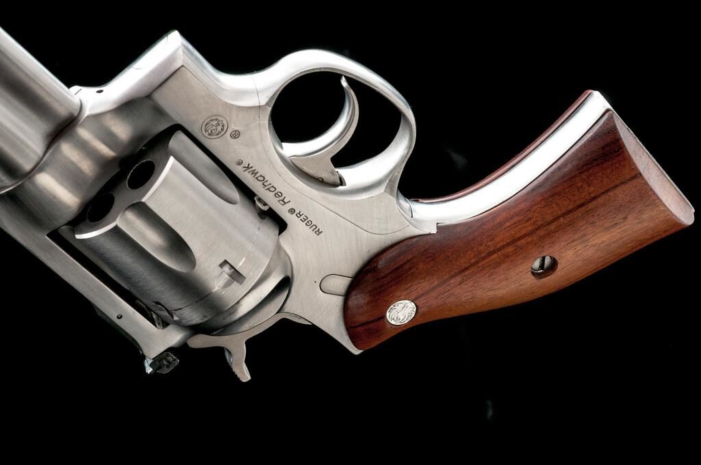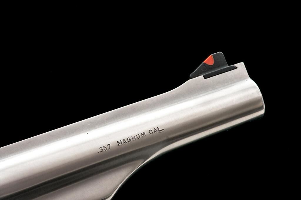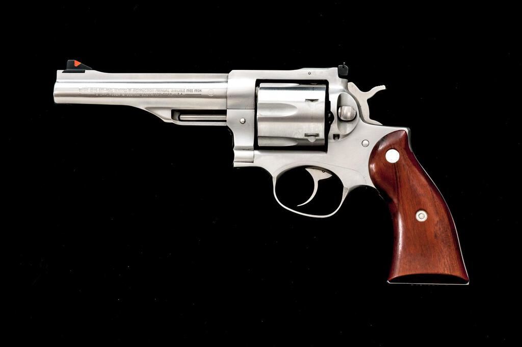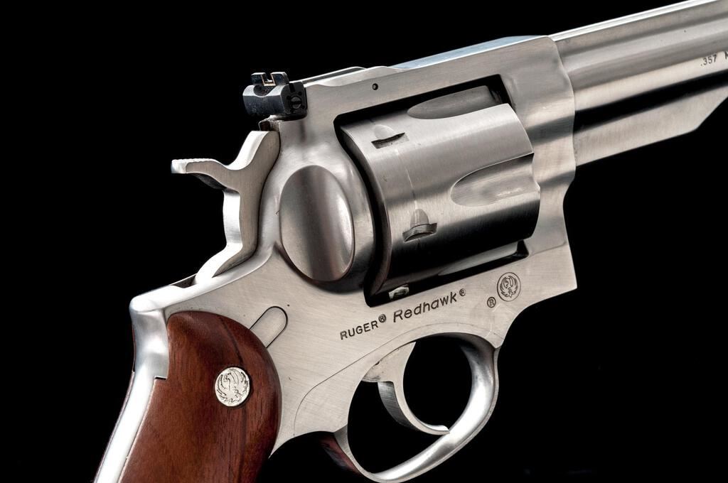 Ruger Redhawk Double Action Revolver, #501-45102, .357 Magnum cal., 5.5" ribbed barrel, orange insert ramped blade and square-notched adjustable rear sights, smooth wood Ruger two-piece medallion grips, in all stainless steel construction. Mfg'd 1985. Revolver is in near excellent overall condition, with scattered handling marks and a light index line on the cylinder. Smooth wood grips are near excellent with small mars and storage marks. Action is crisp, bore is very good. Est.: $750-$1,000. (Modern/PPT)