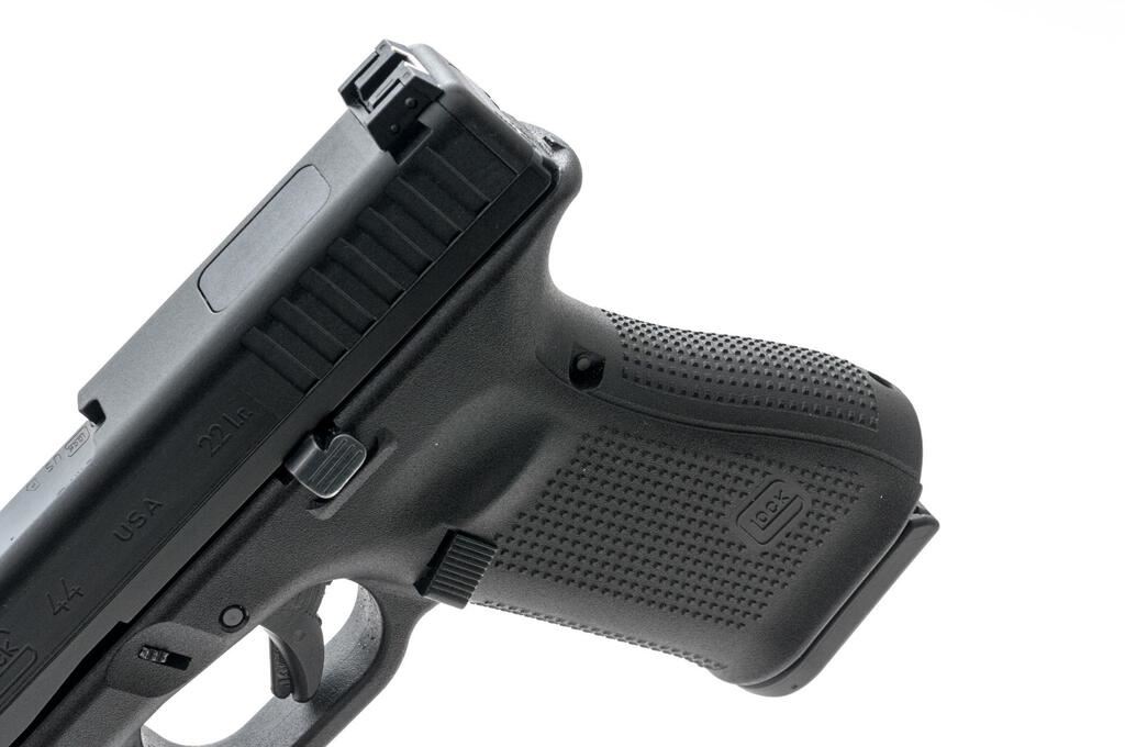 Like New Glock Model 44 Gen 5 Semi-Automatic Pistol, #ADPU062, .22 LR cal., 4" barrel, lightweight polymer covered steel slide, black polymer frame with integral lower accessory rail, white dot front sight and square-notched white outline rear sight, with three (3) 10-rd. Glock magazines. In matching numbered Glock case with sealed instruction manual and four (4) additional interchangeable back straps. Pistol is in like new condition, appearing to have been handled and fired very little. Bore is mirror bright. Est.: $300-$400. (Modern) (Not available to Calif. residents.)
