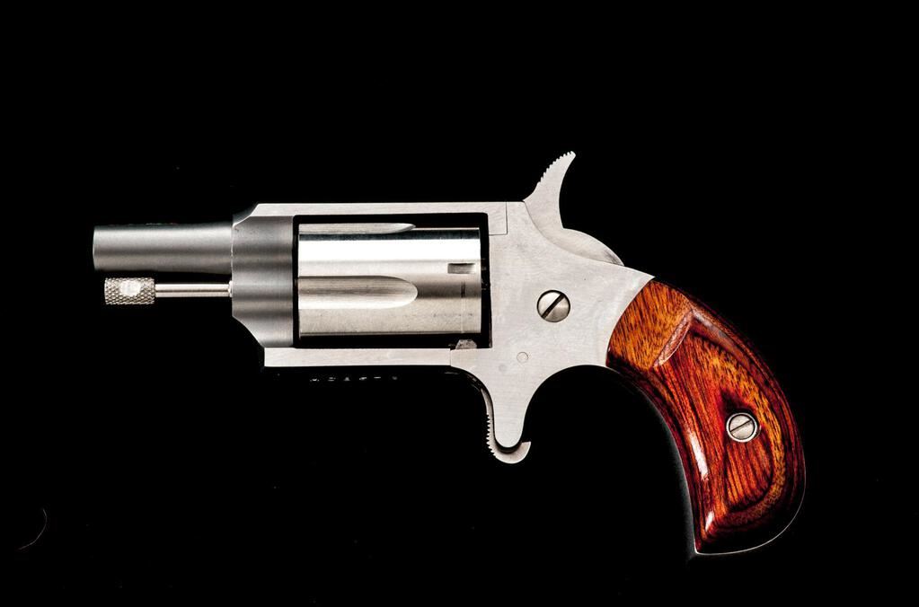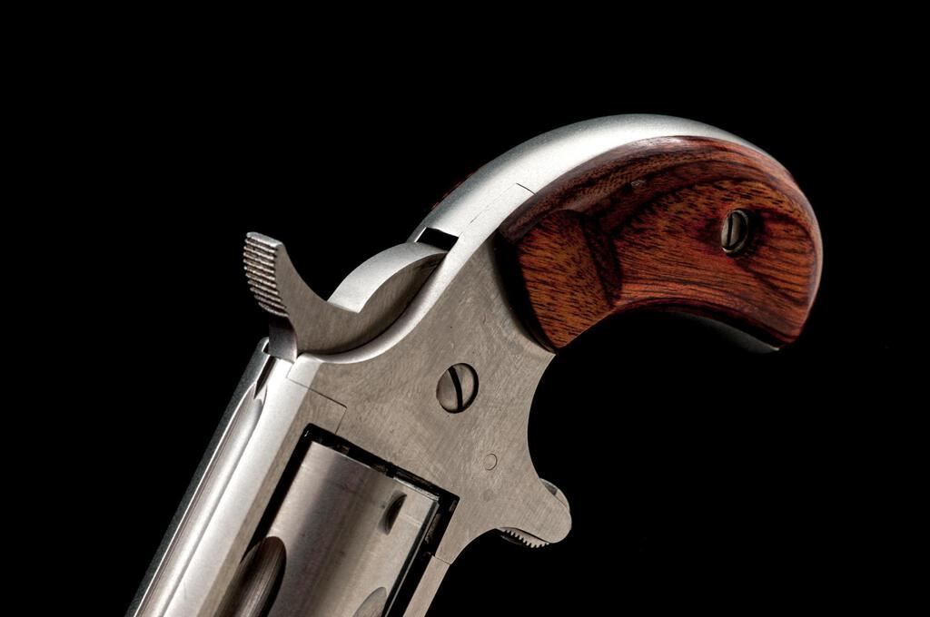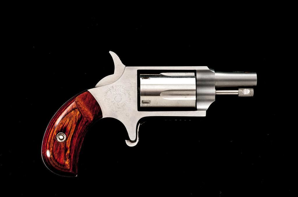 Freedom Arms Mini Single Action 5-Shot Revolver, #A68579, .22 LR cal., 1" barrel with a missing blade front and fixed rear sights, brushed stainless steel finish, 5-shot fluted cylinder, smooth two-piece laminate wood bird's head grips, spur trigger. Pistol is in near excellent overall condition showing little use, with the front sight having been removed and left vacant. There is light surface rust where the sight was removed, otherwise the revolver shows only light handling marks. Right side of frame is marked "CASULL'S IMPROVEMENT/FREEDOM ARMS". Bird's head grips are excellent and fit well. Bore is good and action is crisp. Est.: $200-$400. (Modern/PPT)