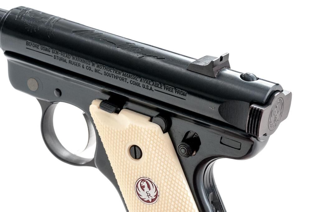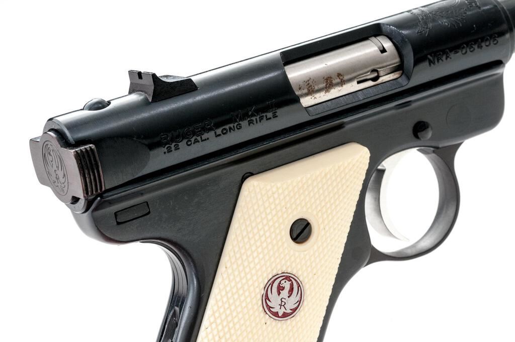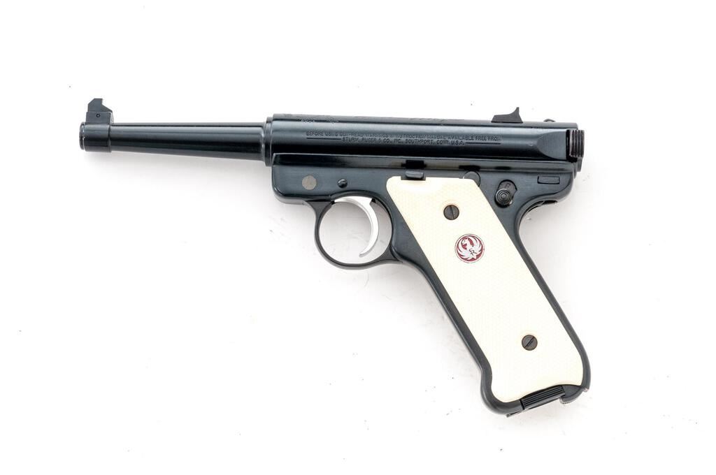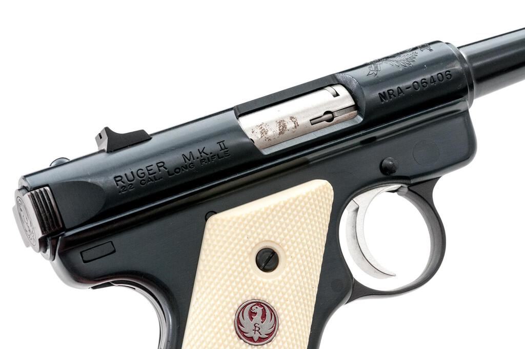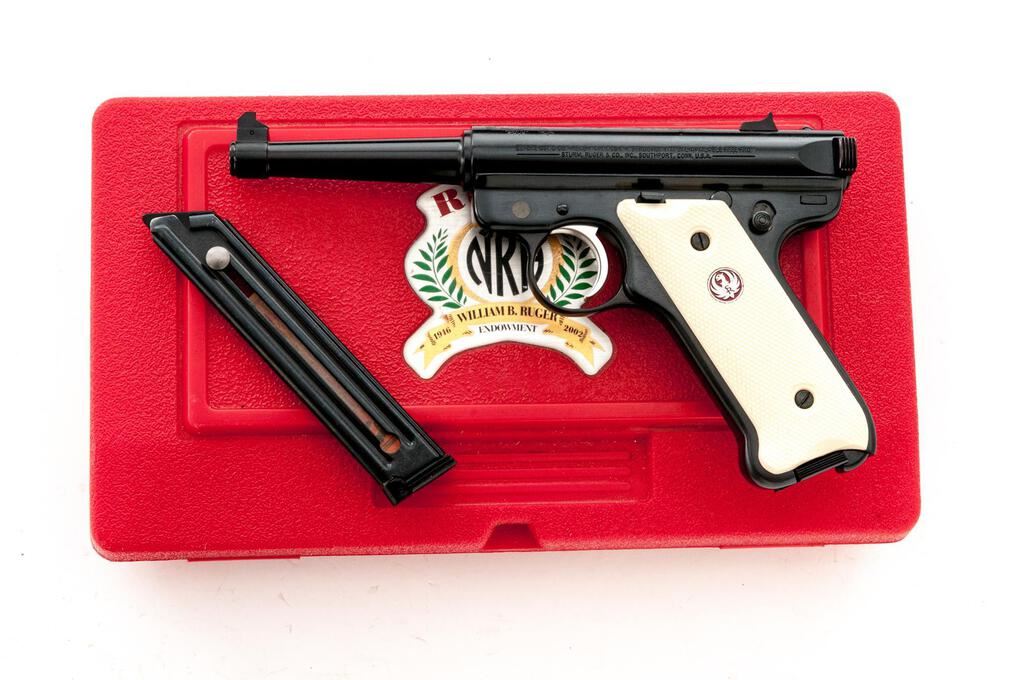 Ruger MK II NRA William B. Ruger Endowment Semi-Automatic Pistol, #NRA-06406, .22 LR cal., 4.75" tapered barrel, Patridge front and square-notched fixed rear sights, blue finish, ivory plastic checkered two-piece medallion grips, and 10-rd. Ruger marked magazine. Includes the red plastic factory hard case, manual, endowment literature, spent case, and an extra magazine. Mfg'd 2003. Pistol is as new retaining approx. 99% factory blue finish with only light handling marks. There is a crisp Ruger crest and NRA on the receiver along with William B. Ruger's signature. Grips feature a red Ruger logo and are in excellent condition. Action is crisp, bore is excellent. Est.: $500-$700. (Modern/PPT)