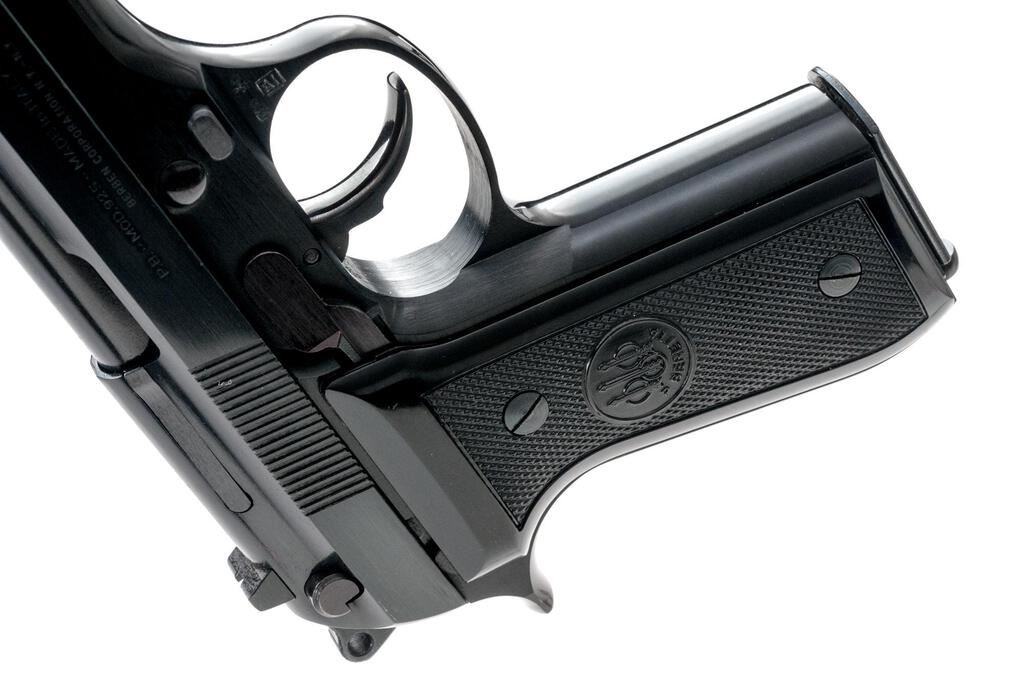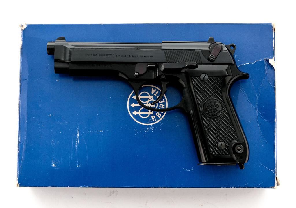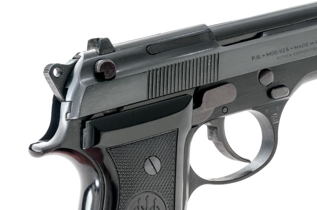 Early Beretta Model 92S Semi-Automatic Pistol, #B93193Z, 9mm, 4.9" barrel, blade front and square-notched fixed rear sights, blue finish, checkered Beretta marked two-piece plastic grips, magazine release button at the base of the left grip, lanyard ring, and 15-rd. Beretta marked hi-cap magazine. Lot includes the factory cardboard box, manual, advisement card, and associated packing materials. Pistol is in excellent overall condition retaining approx. 98%-99% factory blue. Pistol shows no use and may be unfired. Right side of slide is import marked "BERBEN CORPORATION N.Y.- N.Y." Grips are excellent showing little use. Bore is bright with sharp rifling. Action is crisp and locks up tightly on this desirable early Beretta. Est.: $700-$900. (Modern/PPT)(Hi-cap mags not available to Calif. residents.)