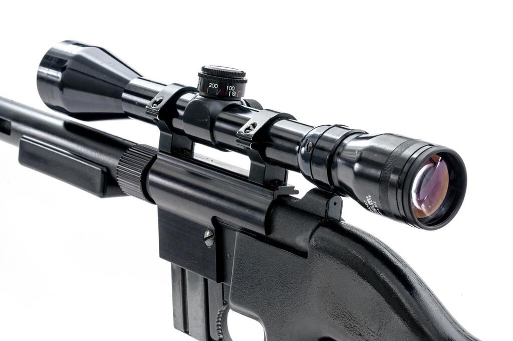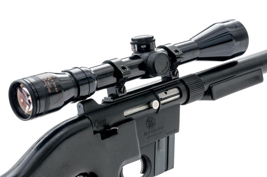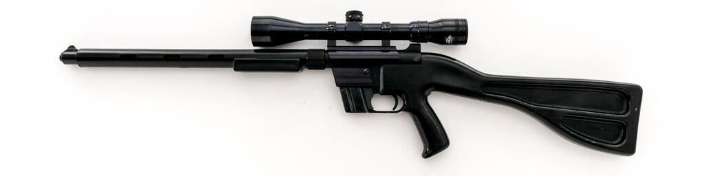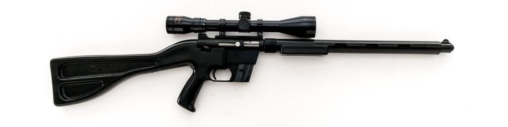 Early Charter Arms AR-7 Explorer Semi-Automatic Takedown Rifle, #A132227, .22 LR cal., 16" barrel with faux shroud, blade front and receiver mounted fixed aperture sights, matte black finish, smooth Cycolac synthetic pistol grip stock, 8-rd. unmarked detachable magazine, topped with a one-piece base, Weaver style rings, and a Tasco Supercon 3-9x40 variable-power rifle scope in gloss black with a duplex reticle providing clear optics. Lot includes a rubber bikini style scope cover. Rifle is in very good condition with light handling marks and minor loss of finish at the muzzle, retaining approx. 90%-95% factory finish. The synthetic stock has small scrapes and scratches with scattered losses of finish. Stock is marked "KIM TODD MFG" inside left side of the buttstock. Action locks up tight, bore is very good with sharp rifling. Est.: $150-$250. (Modern)