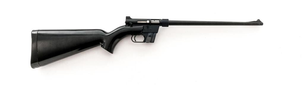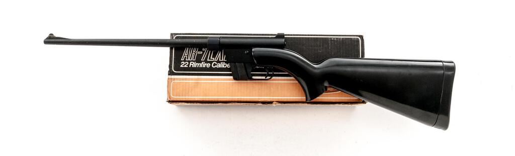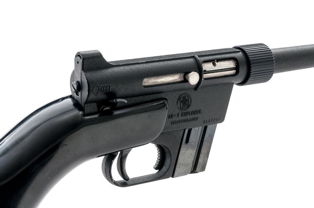 Charter Arms AR-7 Explorer Semi-Automatic Takedown Rifle, #A157755, .22 LR cal., 16" barrel, ramped blade front and receiver mounted peep sights, black finish, Cycolac synthetic stock, one 8-rd. detachable magazine, and original factory cardboard box with matching end label. Rifle is in very good overall condition retaining a significant amount of matted black finish, with wear at the muzzle, scratches, and small mars from carry and use. The synthetic stock is good with light scratches and handling marks only. Action functions smoothly, bore is good with defined rifling. Est.: $200-$300. (Modern)