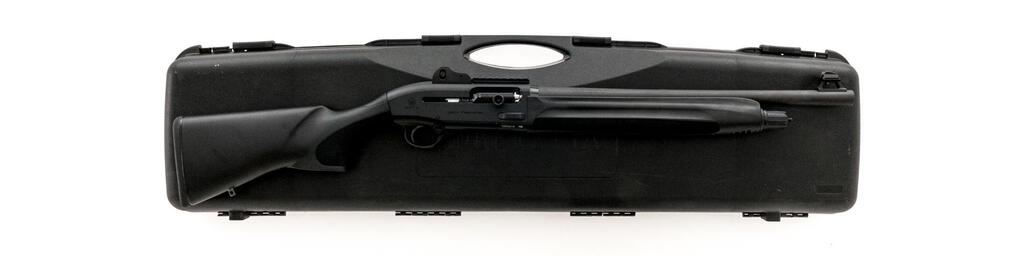 Beretta 1301 Tactical Semi-Automatic Shotgun, #TA034016, 12 ga., 18.5" barrel with tactical sights, 3" chamber, fitted for screw-in choke tubes, black plastic checkered pistol grip stock and black plastic checkered forend. Condition is excellent, appearing unfired. Includes black plastic Benelli hard case, choke tube wrench, two (2) magazine plugs to reduce capacity, safety instructions, and a stock spacer to increase length of pull. Est.: $900-$1,200. (Modern)