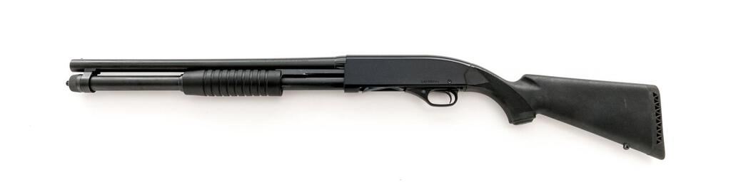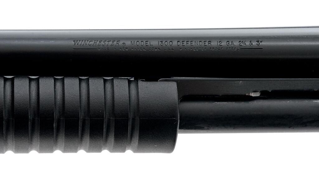 Winchester Model 1300 Defender Pump-Action Shotgun, #L2886041, 12 ga., 18'' barrel, matte finish, black synthetic stock, with extended mag tube and bead front sight. Condition is near excellent, showing light use with light scuffs, rub marks to left side of frame, and thinning to magazine tube. Stock is excellent and sports a 3/4" Winchester black rubber recoil pad. Action is crisp, bore is bright, bolt face is clean. Est.: $400-$550. (Modern)