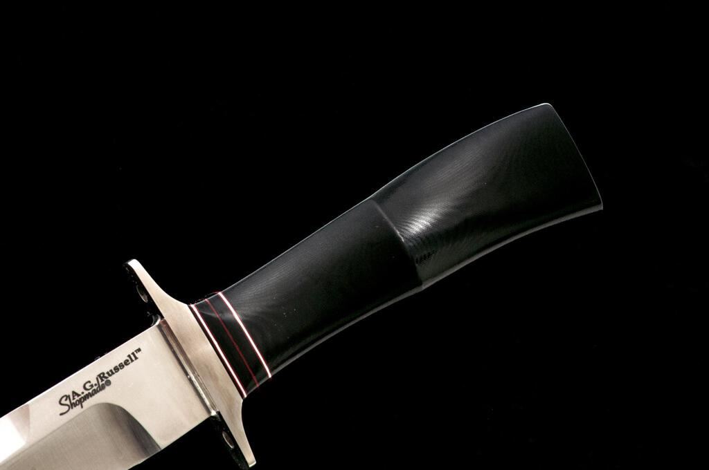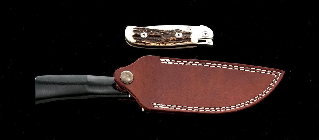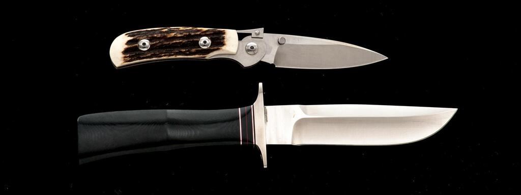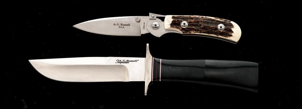 Lot of Two (2) Knives, by A.G. Russell: 1.) Shop-made Fixed Blade Knife, 4-7/8" satin-finished blade, 9-1/2" overall, double stainless hilt, black micarta handle with red spacers, and brown leather sheath. Knife and sheath are in excellent condition. There is a small line of mild surface rust on one side, where the blade meets the hilt, otherwise appearing like new. 2.) One Handed Folding Knife, 3-1/4" satin-finished drop-point blade, 4" OAC, stag handles. Knife is in excellent, as new condition, with only a few very minor handling marks. Est.: $300-$400/Lot.