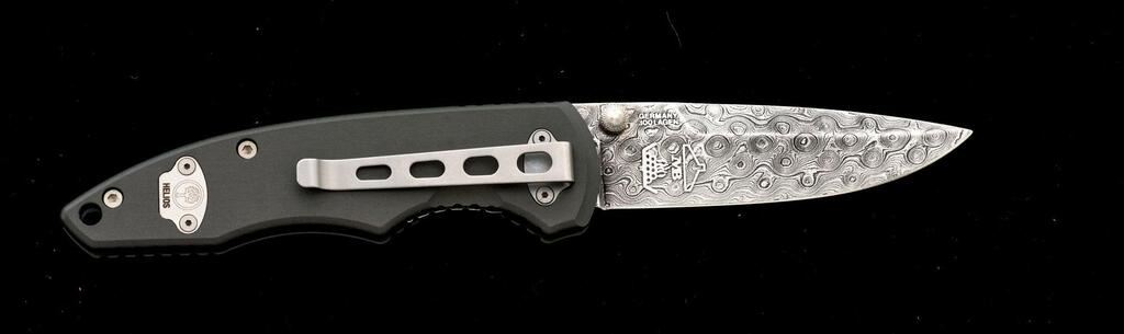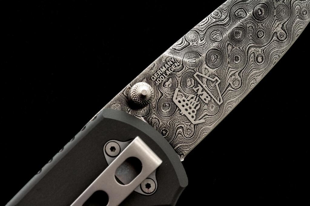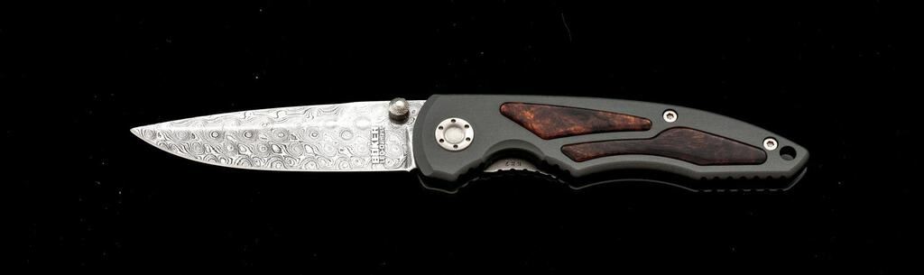 Boker Helios Leo-Damast Linerlock Folding Knife, #682 marked on the liner, 3-3/8" Leo-Damascus pattern blade by Markus Balbach, 4-3/4" OAC, gray aluminum handle with desert ironwood inlays, and pocket clip. Includes the original display box and paperwork. Knife is excellent, appearing as new. Wood box shows a few minor storage type marks. Est.: $250-$400.
