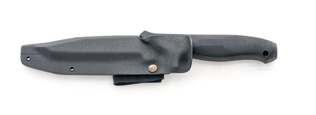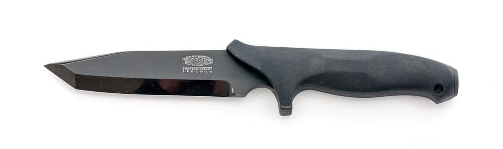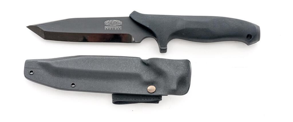 Timberline Knives Emerson/Neeley Specwar Fixed Blade Knife, 5-1/2" black tanto blade, 12" overall, black fiberglass reinforced nylon handle, with black Kydex sheath. Knife is in excellent condition. There are a few very minor sheath marks on the blade. Outside of sheath shows a little mild storage type wear. Est.: $250-$350.