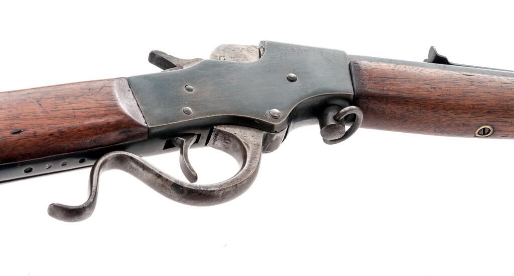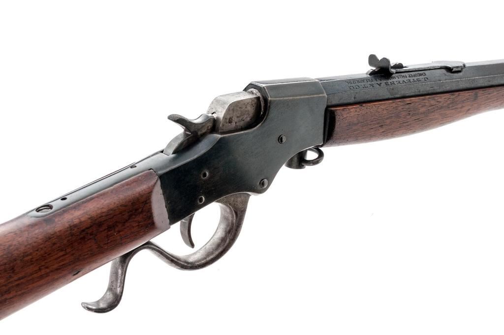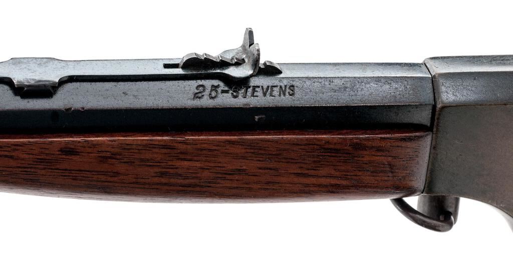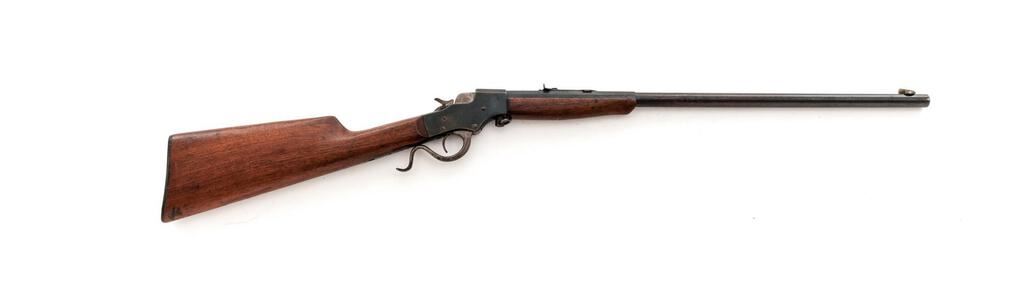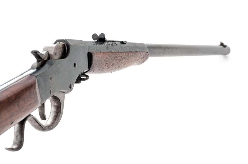 J. Stevens Favorite No. 17 Single Shot Falling Block Rifle, #M86, .25 RF cal., 22" octagon-to-round barrel, factory dovetailed Rocky Mountain front and standard elevator rear sights, blue finish, two-piece smooth wood straight grip stock with a checkered hard rubber Stevens marked buttplate, muted case colors on the breechblock and lever assembly, takedown. Rifle is in fine overall condition retaining a significant amount of toning original finish with the remainder going to gray patina, showing light scratches and sharp edges. Stock is good with light mars and a replacement screw in the buttplate. Action locks up tightly; bore is fair with light roughness and may well clean to good. Est.: $200-$300. (C&R)