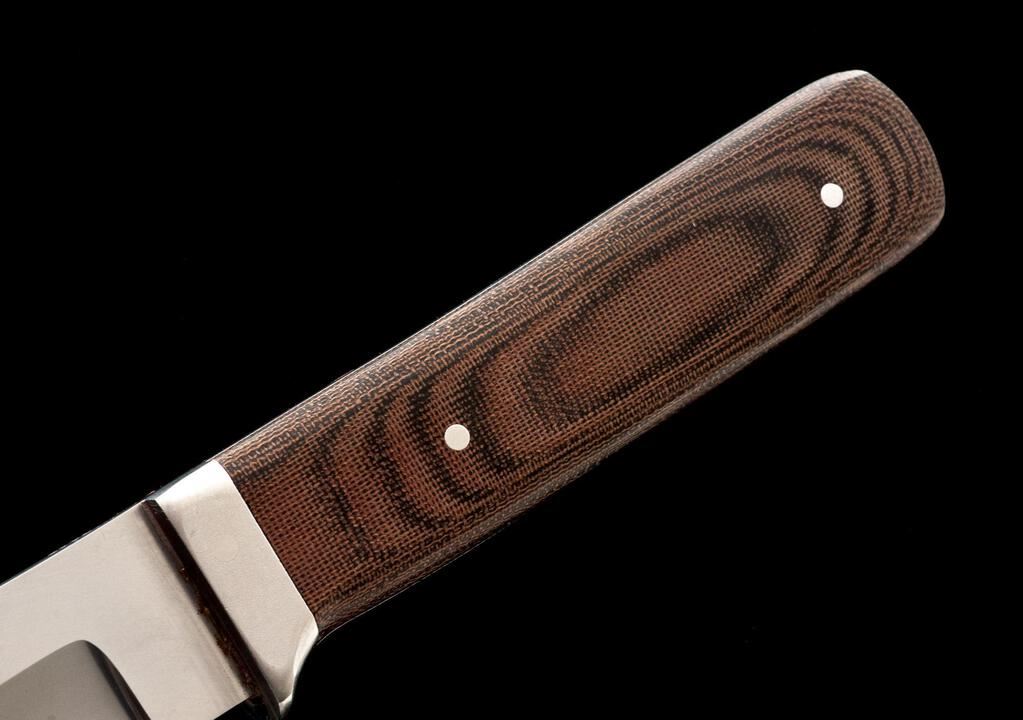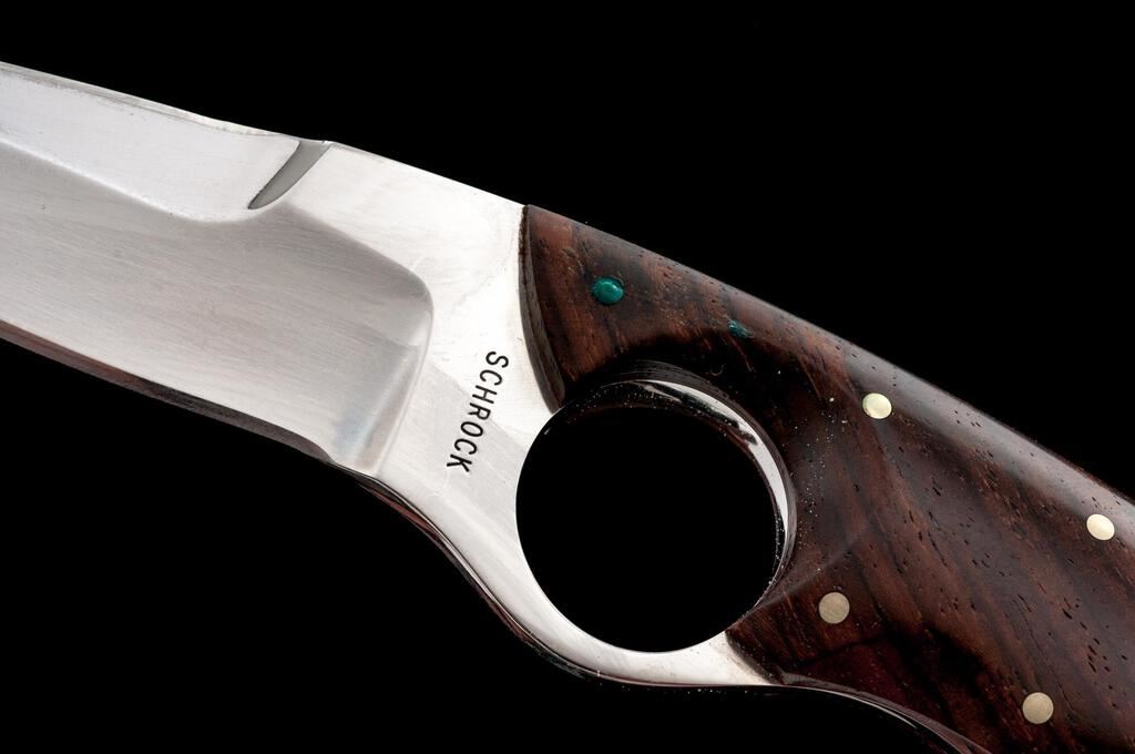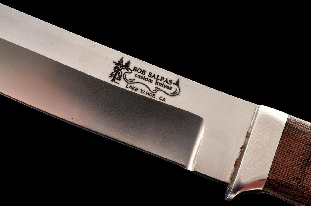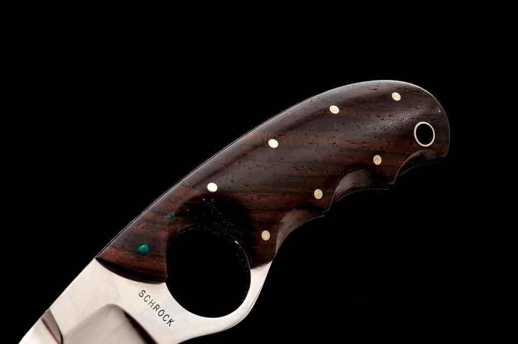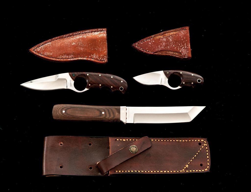 Lot of Three (3) Custom Fixed Blade Knives, by Alan Schrock and Bob Salpas: 1.) Ring Dagger, by Alan Schrock, 3-1/4" double-edged blade, 7" overall, wood handles, with tan leather sheath. Sheath has a belt clip. Knife is in excellent overall condition, appearing unused. There is a little verdigris on the nickel silver pins. Sheath needs to be cleaned as it has patches of light mildew staining. 2.) Ring Knife, by Alan Schrock, 2" drop-point blade, 4-1/2" overall, wood handles, with tan leather sheath. Condition is near excellent with a few fine scratches on the blade. There is a little verdigris on the nickel silver pins. Sheath needs to be cleaned as it has patches of light mildew staining. 3.) Tanto, by Bob Salpas, 5-1/4" satin-finished blade, 9-3/4" overall, brown micarta handles with the original brown leather sheath. Condition is near excellent. There is mild surface rust along the protected area where the blade and bolster meet. Otherwise, the knife is like new. Sheath has a few light surface scuffs and scratches. Est.: $350-$500/Lot.